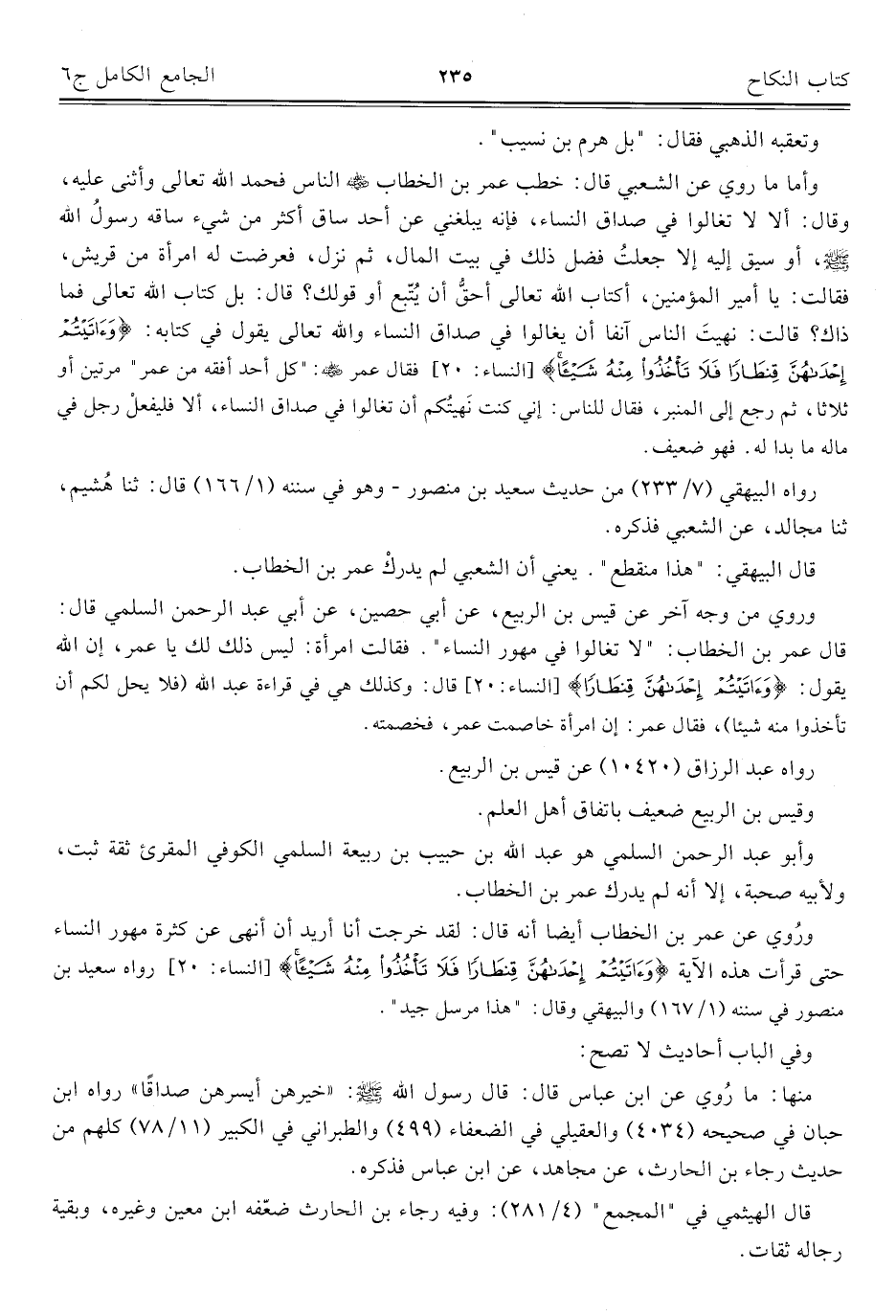 ورُوي عن عمر بن الخطاب أيضا أنه قال: لقد خرجت أنا أريد أن أنهى عن كثرة مهور النساء حتى قرأت هذه الآية {وَآتَيْتُمْ إِحْدَاهُنَّ قِنْطَارًا فَلَا تَأْخُذُوا مِنْهُ شَيْئًا} [النساء: ٢٠] رواه سعيد بن منصور في سننه (١/ ١٦٧) والبيهقي وقال: "هذا مرسل جيد".