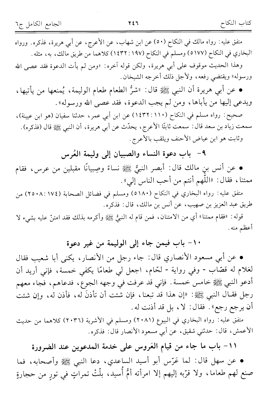 • عن أبي هريرة أن النبي صلى الله عليه وسلم قال: "شرُّ الطعام طعام الوليمة، يُمنعها من يأتيها، ويدعى إليها من يأباها، ومن لم يجب الدعوة، فقد عصى الله ورسوله".