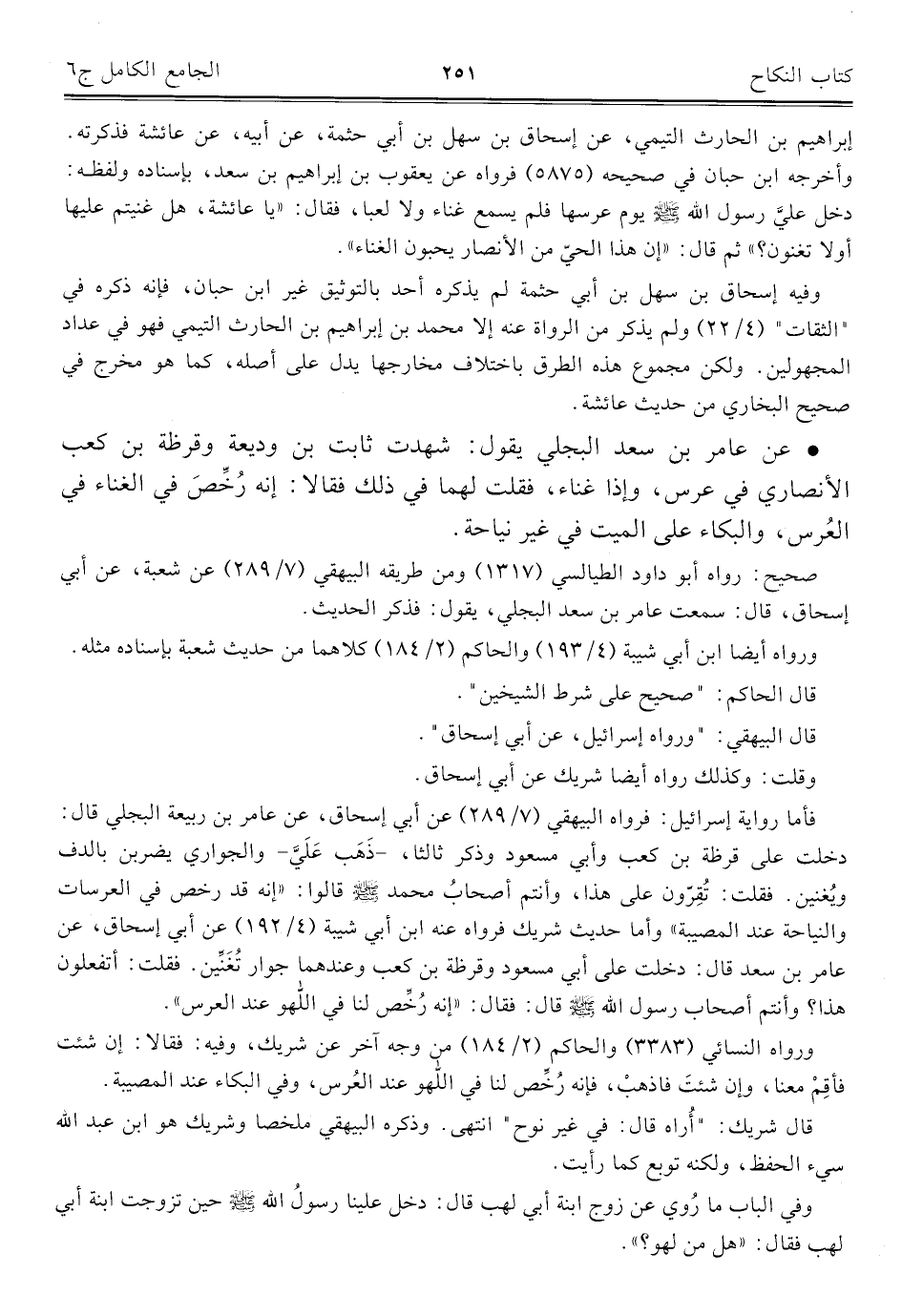 إبراهيم بن الحارث التيمي، عن إسحاق بن سهل بن أبي حثمة، عن أبيه، عن عائشة فذكرته. وأخرجه ابن حبان في صحيحه (٥٨٧٥) فرواه عن يعقوب بن إبراهيم بن سعد، بإسناده ولفظه: دخل عليَّ رسول الله - صلى الله عليه وسلم - يوم عرسها فلم يسمع غناء ولا لعبا، فقال: "يا عائشة، هل غنيتم عليها أولا تغنون؟ "ثم قال: إن هذا الحيّ من الأنصار يحبون الغناء".