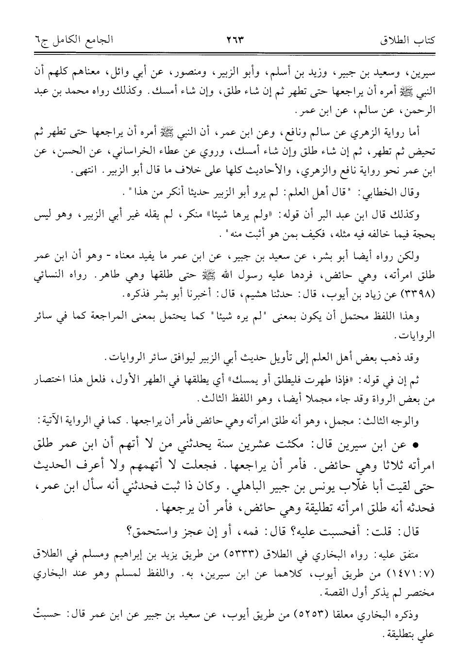 • عن ابن سيرين قال: مكثت عشرين سنة يحدثني من لا أنهم أن ابن عمر طلق امرأته ثلاثا وهي حائض. فأمر أن يراجعها. فجعلت لا أتهمهم ولا أعرف الحديث حتى لقيت أبا غلّاب يونس بن جبير الباهلي. وكان ذا ثبت فحدثني أنه سأل ابن عمر، فحدثه أنه طلق امرأته تطليقة وهي حائض، فأمر أن يرجعها.