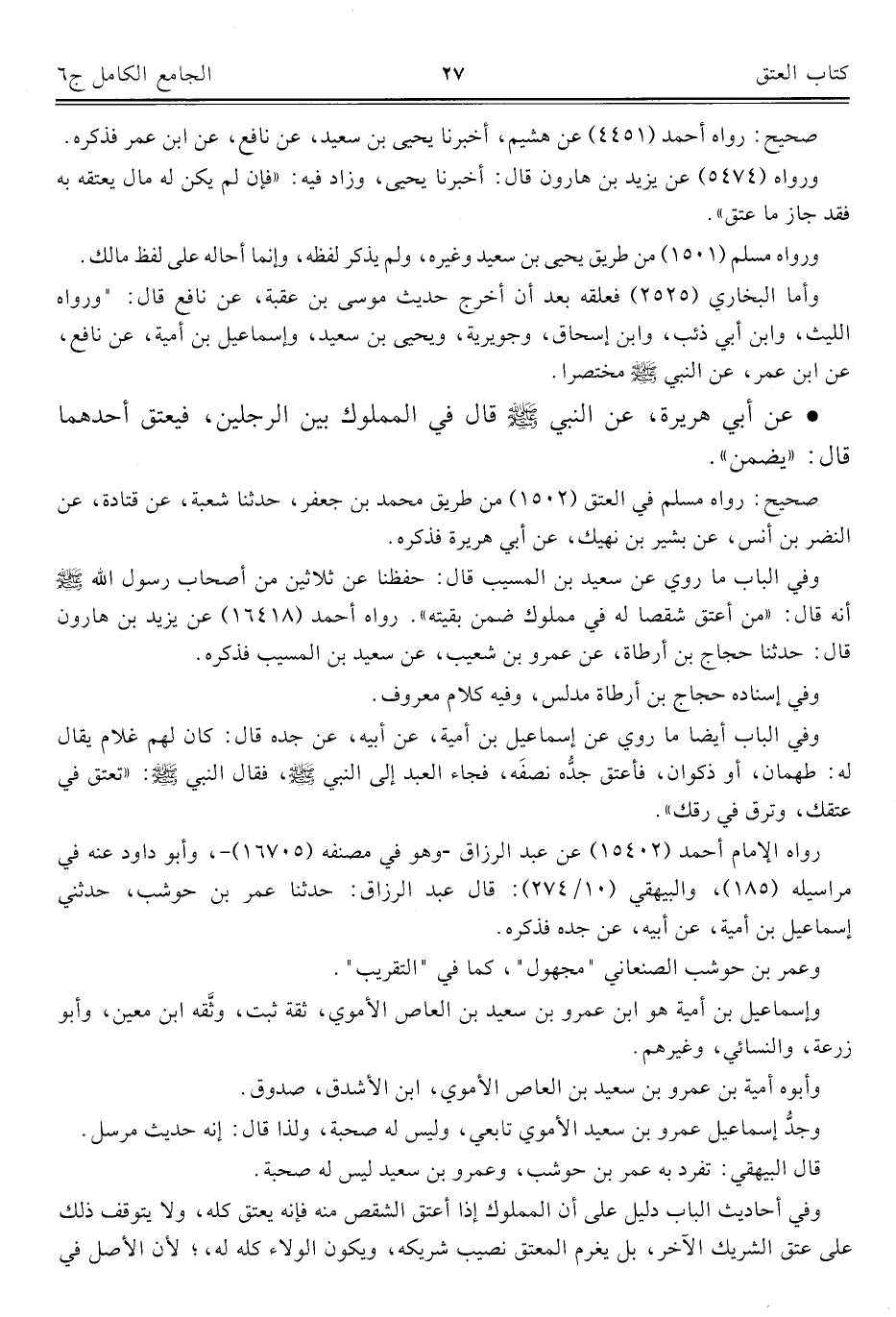وفي الباب ما روي عن سعيد بن المسيب قال: حفظنا عن ثلاثين من أصحاب رسول اللَّه -صلى اللَّه عليه وسلم- أنه قال: "من أعتق شقصا له في مملوك ضمن بقيته". رواه أحمد (١٦٤١٨) عن يزيد بن هارون قال: حدثنا حجاج بن أرطاة، عن عمرو بن شعيب، عن سعيد بن المسيب فذكره.