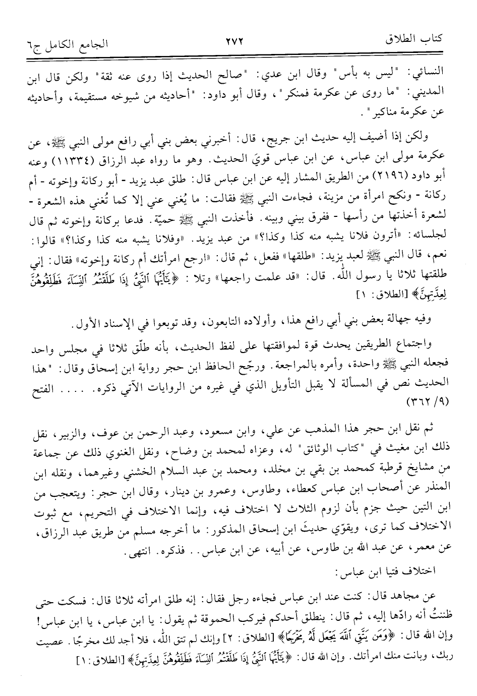 واجتماع الطريقين يحدث قوة لموافقتها على لفظ الحديث، بأنه طلّق ثلاثا في مجلس واحد فجعله النبي - صلى الله عليه وسلم - واحدة، وأمره بالمراجعة. ورجح الحافظ ابن حجر رواية ابن إسحاق وقال: "هذا الحديث نص في المسألة لا يقبل التأويل الذي في غيره من الروايات الآتي ذكره. .... الفتح (٩/ ٣٦٢).