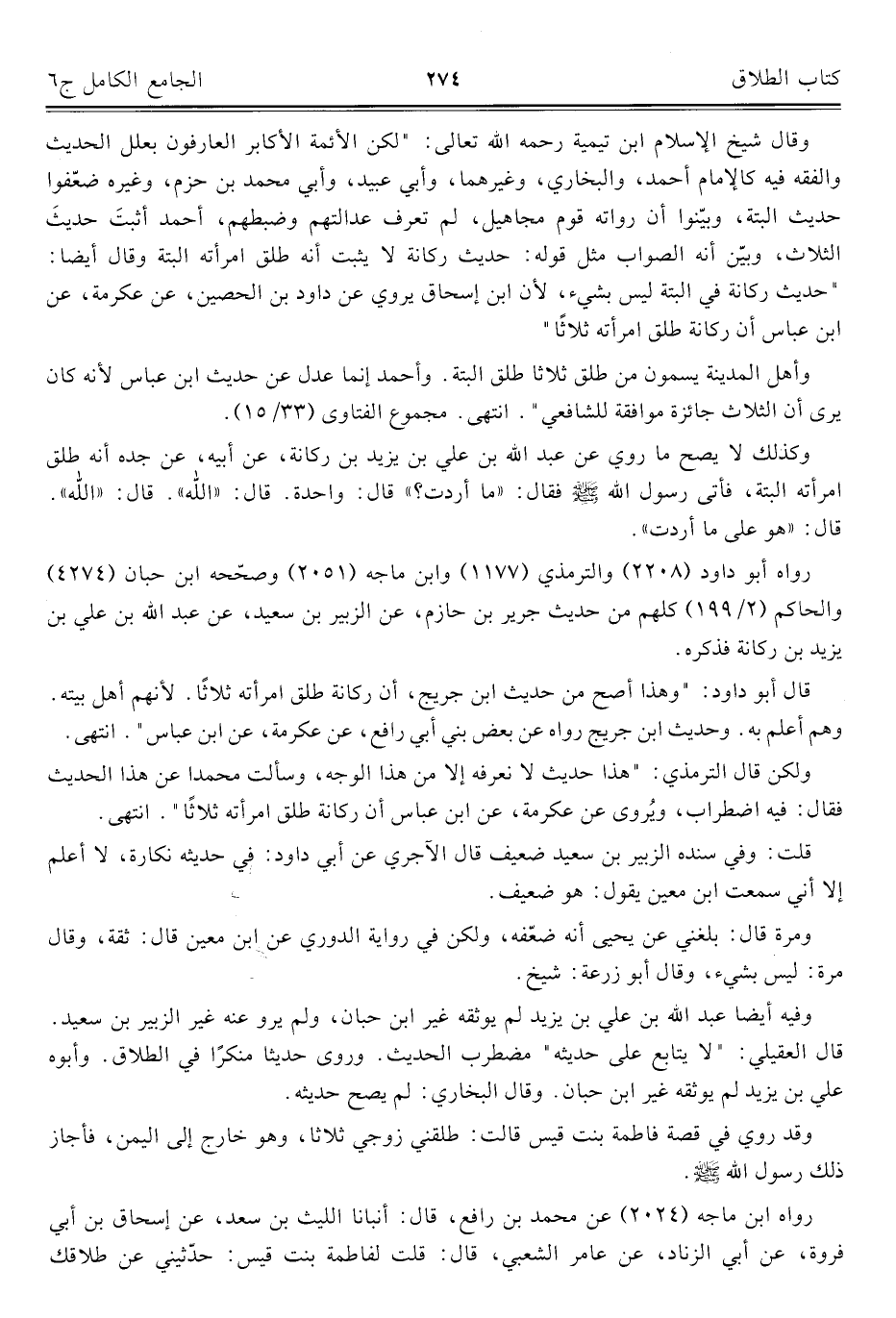 وقال شيخ الإسلام ابن تيمية رحمه الله تعالى: "لكن الأئمة الأكابر العارفون بعلل الحديث والفقه فيه كالإمام أحمد، والبخاري، وغيرهما، وأبي عبيد، وأبي محمد بن حزم، وغيره ضعّفوا حديث البتة، وبيّنوا أن رواته قوم مجاهيل، لم تعرف عدالتهم وضبطهم، أحمد أثبتَ حديثَ الثلاث، وبيّن أنه الصواب مثل قوله: حديث ركانة لا يثبت أنه طلق امرأته البتة وقال أيضًا: "حديث ركانة في البتة ليس بشيء، لأن ابن إسحاق يروي عن داود بن الحصين، عن عكرمة، عن ابن عباس أن ركانة طلق امرأته ثلاثًا".