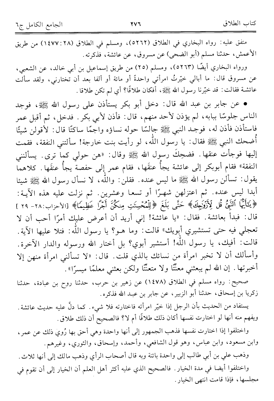 • عن جابر بن عبد الله قال: دخل أبو بكر يستأذن على رسول الله - صلى الله عليه وسلم -، فوجد الناس جلوسًا ببابه، لم يؤذن لأحد منهم، قال: فأذن لأبي بكر. فدخل، ثم أقبل عمر فاستأذن فأذن له، فوجد النبي - صلى الله عليه وسلم - جالسًا حوله نساؤه واجمًا ساكتًا قال: لأقولن شيئًا أُضحك النبي - صلى الله عليه وسلم - فقال: يا رسول الله، لو رأيت بنت خارجة! سألتني النفقة، فقمت إليها فوجأت عنقها. فضحِكَ رسول الله - صلى الله عليه وسلم - وقال: "هن حولي كما ترى. يسألني النفقة" فقام أبو بكر إلى عائشة يجأُ عنقَها، فقام عمر إلى حفصة يجأُ عنقَها. كلاهما يقول: تسألن رسول الله - صلى الله عليه وسلم - ما ليس عنده. فقلن: والله، لا نسأل رسول الله - صلى الله عليه وسلم - شيئا أبدا ليس عنده. ثم اعتزلهن شهرًا أو تسعا وعشرين. ثم نزلت عليه هذه الآية: {يَاأَيُّهَا النَّبِيُّ قُلْ لِأَزْوَاجِكَ} حَتَّى بَلَغَ {لِلْمُحْسِنَاتِ مِنْكُنَّ أَجْرًا عَظِيمًا} [الأحزاب: ٢٨ - ٢٩] قال: فبدأ بعائشة. فقال: "يا عائشة! إني أريد أن أعرض عليك أمرًا أحب أن لا تعجلي فيه حتى تستشيري أبويك" قالت: وما هو؟ يا رسول الله: فتلا عليها الآية. قالت: أفيك، يا رسول الله! أستشير أبوي؟ بل أختار الله ورسوله والدار الآخرة. وأسألك أن لا تخبر امرأة من نسائك بالذي قلت. قال: "لا تسألني امرأة منهن إلا أخبرتها. إن الله لم يبعثني معنِّتًا ولا متعنِّتًا ولكن بعثني معلمًا ميسرًا".