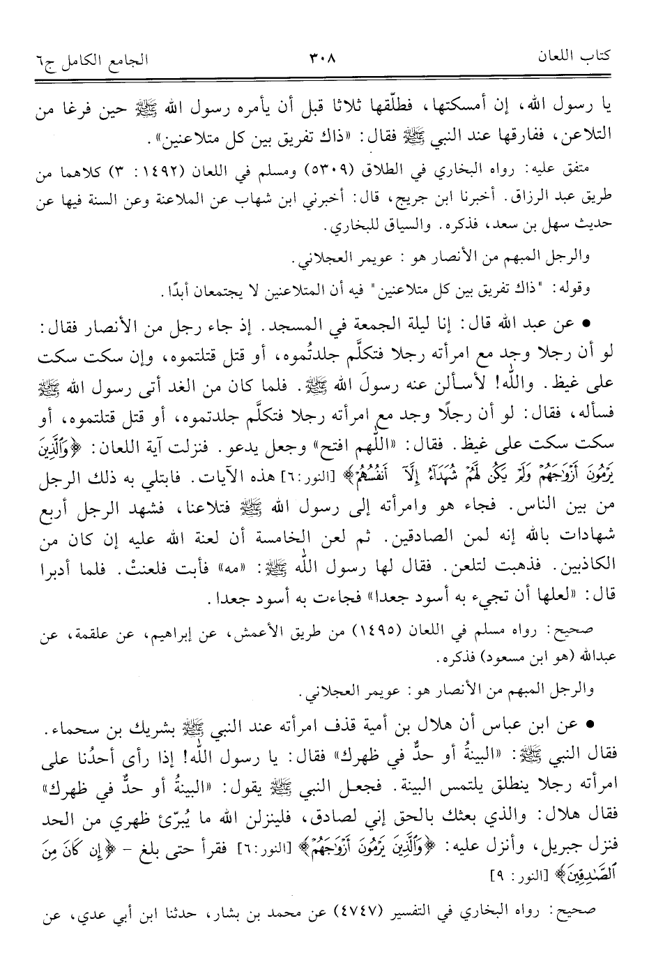 • عن عبد الله قال: إنا ليلة الجمعة في المسجد. إذ جاء رجل من الأنصار فقال: لو أن رجلا وجد مع امرأته رجلا فتكلَّم جلدتُموه، أو قتل قتلتموه، وإن سكت سكت على غيظ. والله! لأسألن عنه رسولَ الله - صلى الله عليه وسلم -. فلما كان من الغد أتى رسول الله - صلى الله عليه وسلم - فسأله، فقال: لو أن رجلًا وجد مع امرأته رجلا فتكلَّم جلدتموه، أو قتل قتلتموه، أو سكت سكت على غيظ. فقال: "اللهم افتح" وجعل يدعو. فنزلت آية اللعان: {وَالَّذِينَ يَرْمُونَ أَزْوَاجَهُمْ وَلَمْ يَكُنْ لَهُمْ شُهَدَاءُ إِلَّا أَنْفُسُهُمْ} [النور: ٦] هذه الآيات. فابتلي به ذلك الرجل من بين الناس. فجاء هو وامرأته إلى رسول الله - صلى الله عليه وسلم - فتلاعنا، فشهد الرجل أربع شهادات بالله إنه لمن الصادقين. ثم لعن الخامسة أن لعنة الله عليه إن كان من الكاذبين. فذهبت لتلعن. فقال لها رسول الله - صلى الله عليه وسلم -: "مه" فأبت فلعنتْ. فلما أدبرا قال: "لعلها أن تجيء به أسود جعدا" فجاءت به أسود جعدا.
