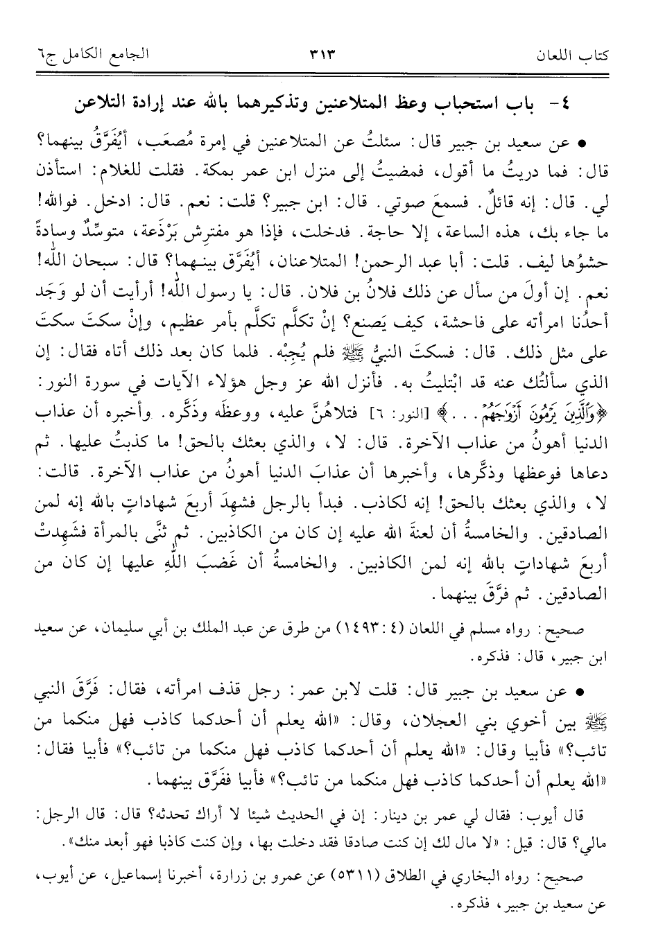 • عن سعيد بن جبير قال: قلت لابن عمر: رجل قذف امرأته، فقال: فرَّق النبي - صلى الله عليه وسلم - بين أخوي بني العجلان، وقال: "الله يعلم أن أحدكما كاذب فهل منكما من تائب؟ " فأبيا وقال: "الله يعلم أن أحدكما كاذب فهل منكما من تائب؟ " فأبيا فقال: "الله يعلم أن أحدكما كاذب فهل منكما من تائب؟ " فأبيا ففَرَّق بينهما.
