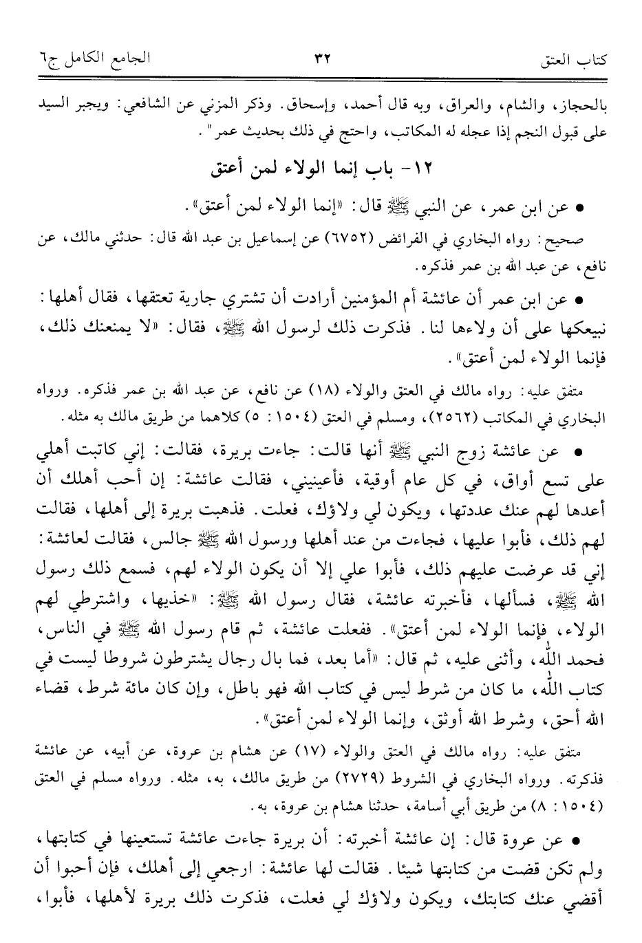 متفق عليه: رواه مالك في العتق والولاء (١٧) عن هشام بن عروة، عن أبيه، عن عائشة فذكرته. ورواه البخاري في الشروط (٢٧٢٩) من طريق مالك، به، مثله. ورواه مسلم في العتق (١٥٠٤: ٨) من طريق أبي أسامة، حدثنا هشام بن عروة، به.