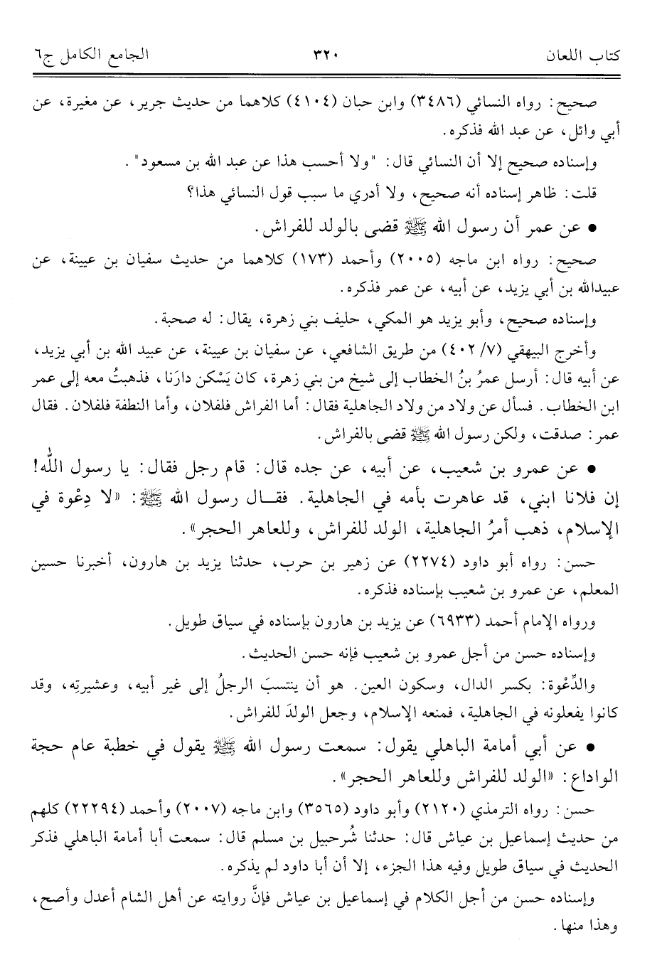 • عن عمر أن رسول الله صلى الله عليه وسلم قضى بالولد للفراش.