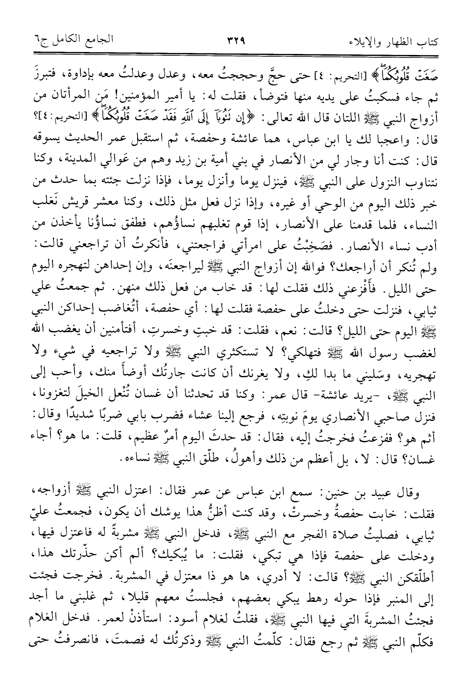 صَغَتْ قُلُوبُكُمَا} [التحريم: ٤] حتى حجَّ وحججتُ معه، وعدل وعدلتُ معه بإداوة، فتبرزَ ثم جاء فسكبتُ على يديه منها فتوضأ، فقلت له: يا أمير المؤمنين! مَن المرأتان من أزواج النبي - صلى الله عليه وسلم - اللتان قال الله تعالى: {{إِنْ تَتُوبَا إِلَى اللَّهِ فَقَدْ صَغَتْ قُلُوبُكُمَا} [التحريم: ٤]؟ قال: واعجبا لك يا ابن عباس، هما عائشة وحفصة، ثم استقبل عمر الحديث يسوقه قال: كنت أنا وجار لي من الأنصار في بني أمية بن زيد وهم من عَوالي المدينة، وكنا نتناوب النزول على النبي - صلى الله عليه وسلم -، فينزل يوما وأنزل يوما، فإذا نزلت جئته بما حدث من خبر ذلك اليوم من الوحي أو غيره، وإذا نزل فعل مثل ذلك، وكنا معشر قريش نغلب النساء، فلما قدمنا على الأنصار، إذا قوم تغلبهم نساؤُهم، فطفق نساؤُنا يأخذن من أدب نساء الأنصار. فصَخِبْتُ على امرأتي فراجعتني، فأنكرتُ أن تراجعني قالت: ولم تُنكر أن أراجعك؟ فوالله إن أزواج النبي - صلى الله عليه وسلم - ليراجعنَه، وإن إحداهن لتهجره اليوم حتى الليل. فأَفْزعني ذلك فقلت لها: قد خاب من فعل ذلك منهن. ثم جمعتُ علي ثيابي، فنزلت حتى دخلتُ على حفصة فقلت لها: أي حفصة، أتُغاضب إحداكن النبي - صلى الله عليه وسلم - اليوم حتى الليل؟ قالت: نعم، فقلت: قد خبتِ وخسرتِ، أفتأمنين أن يغضب الله لغضب رسول الله صلى الله عليه وسلم فتهلكي؟ لا تستكثري النبي صلى الله عليه وسلم ولا تراجعيه في شيء ولا تهجريه، وسَليني ما بدا لكِ، ولا يغرنك أن كانت جارتُك أوضأَ منك، وأحب إلى النبي - صلى الله عليه وسلم -، - يريد عائشة - قال عمر: وكنا قد تحدثنا أن غسان تُنْعل الخيلَ لتغزونا، فنزل صاحبي الأنصاري يومَ نوبتِه، فرجع إلينا عشاء فضرب بابي ضربًا شديدًا وقال: أثم هو؟ ففزعتُ فخرجتُ إليه، فقال: قد حدثَ اليوم أمرٌ عظيم، قلت: ما هو؟ أجاء غسان؟ قال: لا، بل أعظم من ذلك وأهولُ، طلّق النبي - صلى الله عليه وسلم - نساءه.