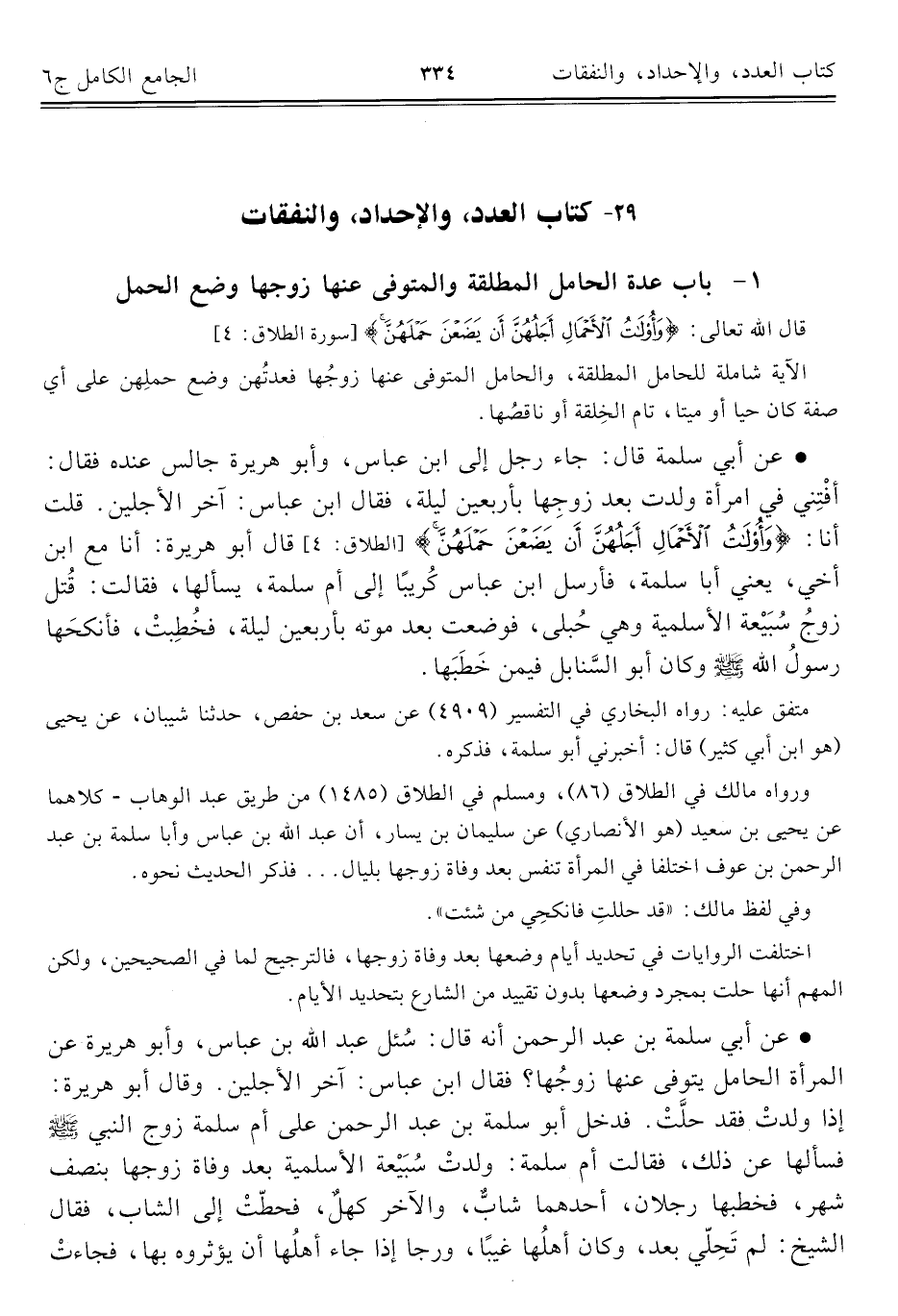 • عن أبي سلمة بن عبد الرحمن أنه قال: سُئل عبد الله بن عباس، وأبو هريرة عن المرأة الحامل يتوفى عنها زوجُها؟ فقال ابن عباس: آخر الأجلين. وقال أبو هريرة: إذا ولدتْ فقد حلَّتْ. فدخل أبو سلمة بن عبد الرحمن على أم سلمة زوج النبي - صلى الله عليه وسلم - فسألها عن ذلك، فقالت أم سلمة: ولدتْ سُبَيْعة الأسلمية بعد وفاة زوجها بنصف شهر، فخطبها رجلان، أحدهما شابٌّ، والآخر كهلٌ، فحطّتْ إلى الشاب، فقال الشيخ: لم تَحِلّي بعد، وكان أهلُها غيبًا، ورجا إذا جاء أهلُها أن يؤثروه بها، فجاءتْ