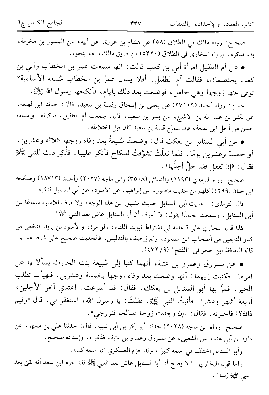 • عن أبي السنابل بن بعكك قال: وضعتْ سُبيعةُ بعد وفاة زوجها بثلاثة وعشرين، أو خمسة وعشرين يومًا. فلما تعلّتْ تشوّفتْ للنكاح فأنكر عليها. فذُكِر ذلك للنبي - صلى الله عليه وسلم - فقال: "إن تفعل فقد حلَّ أجلُها".