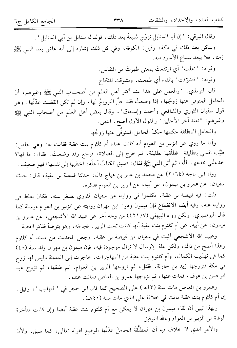 قال الترمذي: "والعمل على هذا عند أكثر أهل العلم من أصحاب النبي - صلى الله عليه وسلم - وغيرهم، أن الحامل المتوفى عنها زوجُها، إذا وضعتْ فقد حلَّ الترويجُ لها، وإن لم تكن انقضت عدّتُها. وهو قول سفيان الثوري والشافعي وأحمد وإسحاق"، وقال بعض أهل العلم من أصحاب النبي - صلى الله عليه وسلم - وغيرهم: "تعتد آخر الأجلين" والقول الأول أصح. انتهى.