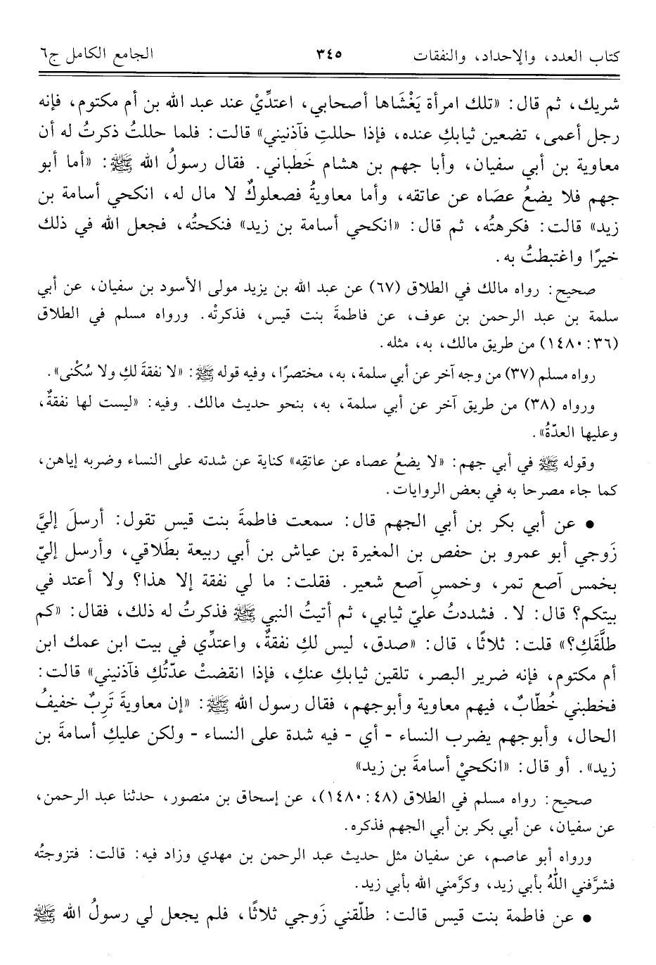 • عن أبي بكر بن أبي الجهم قال: سمعت فاطمةَ بنت قيس تقول: أرسلَ إليَّ زَوجي أبو عمرو بن حفص بن المغيرة بن عياش بن أبي ربيعة بطَلاقي، وأرسل إليّ بخمس آصع تمر، وخمسِ آصع شعير. فقلت: ما لي نفقة إلا هذا؟ ولا أعتد في بيتكم؟ قال: لا. فشددتُ عليّ ثيابي، ثم أتيتُ النبي - صلى الله عليه وسلم - فذكرتُ له ذلك، فقال: "كم طلَّقَكِ؟ " قلت: ثلاثًا، قال: "صدق، ليس لكِ نفقةٌ، واعتدِّي في بيت ابن عمك ابن أم مكتوم، فإنه ضرير البصر، تلقين ثيابكِ عنكِ، فإذا انقضتْ عدّتُكِ فآذنيني" قالت: فخطبني خُطّابٌ، فيهم معاوية وأبو جهم، فقال رسول الله - صلى الله عليه وسلم -: "إن معاويةَ تَرِتٌ خفيفٌ الحال، وأبوجهم يضرب النساء - أي - فيه شدة على النساء - ولكن عليكِ أسامةَ بن زيد". أو قال: "انكحيْ أسامةَ بن زيد"