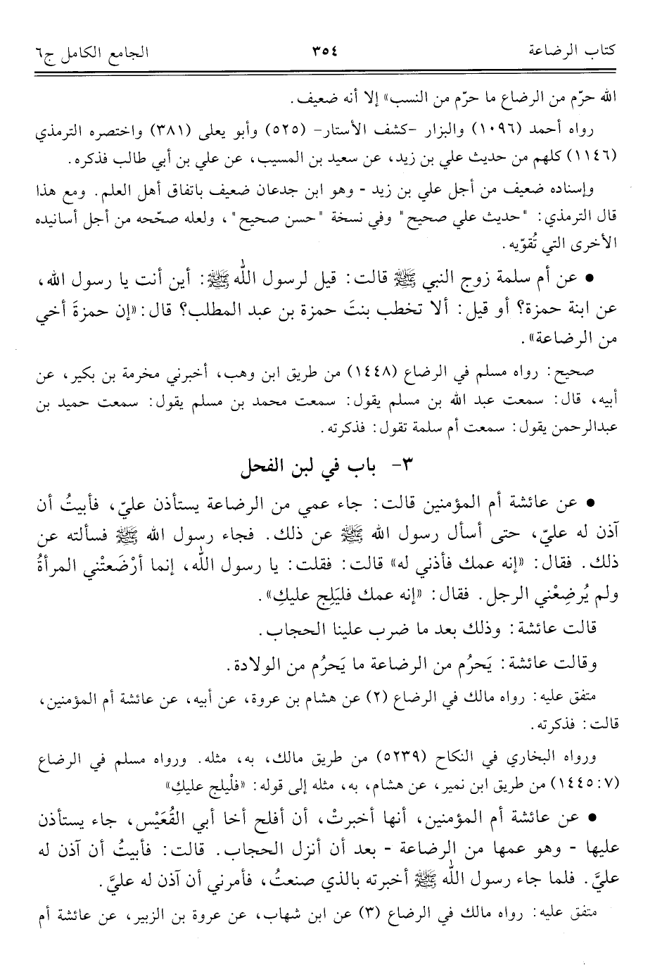 • عن عائشة أم المؤمنين قالت: جاء عمي من الرضاعة يستأذن عليّ، فأبيتُ أن آذن له عليّ، حتى أسأل رسول الله - صلى الله عليه وسلم - عن ذلك. فجاء رسول الله - صلى الله عليه وسلم - فسألته عن ذلك. فقال: "إنه عمك فأذني له" قالت: فقلت: يا رسول الله، إنما أرْضَعتْني المرأةُ ولم يُرضِعْني الرجل. فقال: "إنه عمك فليَلِج عليك".