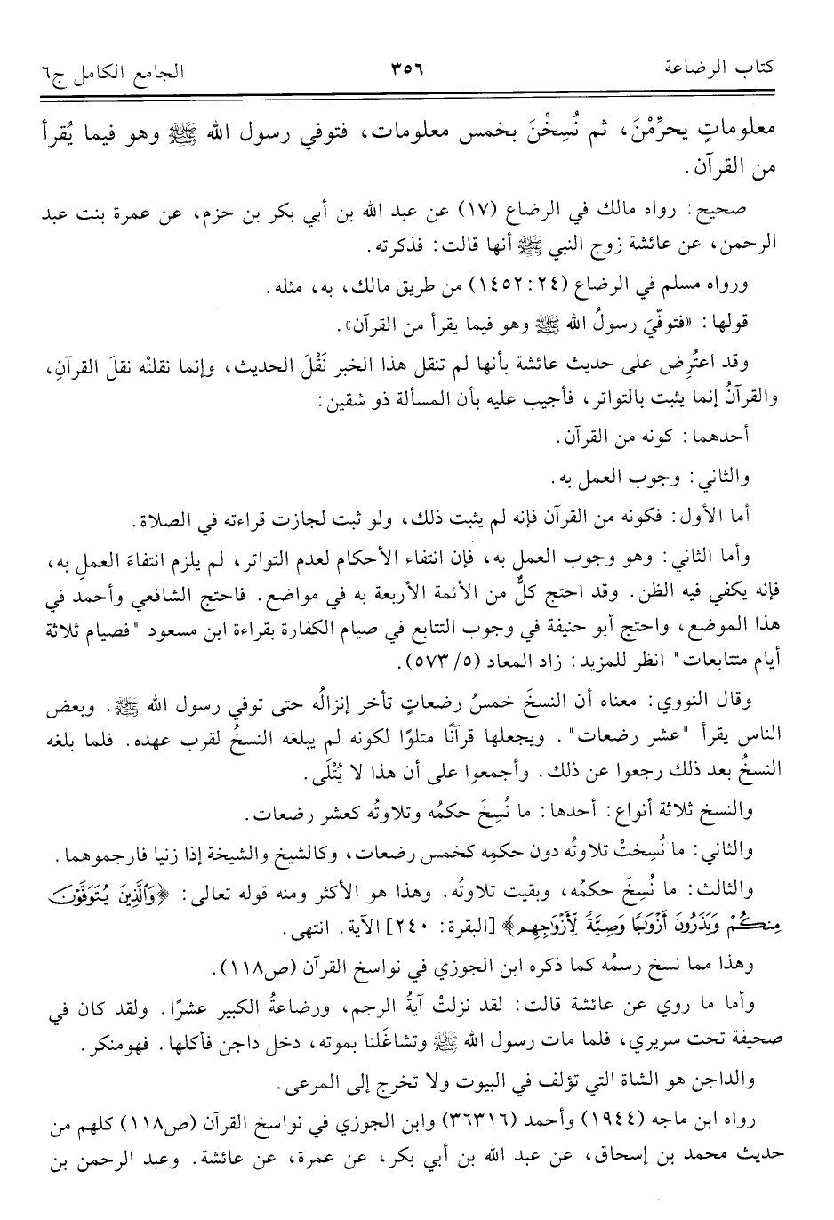 وقال النووي: معناه أن النسخَ خمسُ رضعاتٍ تأخر إنزالُه حتى توفي رسول الله - صلى الله عليه وسلم -. وبعض الناس يقرأ "عشر رضعات". ويجعلها قرأنًا متلوًا لكونه لم يبلغه النسخُ لقرب عهده. فلما بلغه النسخُ بعد ذلك رجعوا عن ذلك. وأجمعوا على أن هذا لا يُتْلَى.
