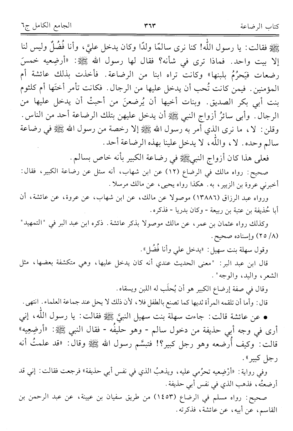 صلى الله عليه وسلم فقالت: يا رسول الله! كنا نرى سالمًا ولدًا وكان يدخل عليَّ، وأنا فُضُلٌ وليس لنا إِلَّا بيت واحد. فماذا ترى في شأنه؟ فقال لها رسول الله - صلى الله عليه وسلم -: "أرضِعيه خمسَ رضعات فيَحرُمُ بلبنها" وكانت تراه ابنا من الرضاعة. فأخذت بذلك عائشة أم المؤمنين. فيمن كانت تُحب أن يدخل عليها من الرجال. فكانت تأمر أختَها أم كلثوم بنت أبي بكر الصديق. وبنات أخيها أن يُرضعنَ من أحبتْ أن يدخل عليها من الرجال. وأبى سائرُ أزواج النَّبِيّ صلى الله عليه وسلم أن يدخل عليهن بتلك الرضاعة أحد من الناس. وقلن: لا، ما نرى الذي أمر به رسول الله - صلى الله عليه وسلم - إِلَّا رخصة من رسول الله - صلى الله عليه وسلم - في رضاعة سالم وحده. لا، والله، لا يدخل علينا بهذه الرضاعة أحد.