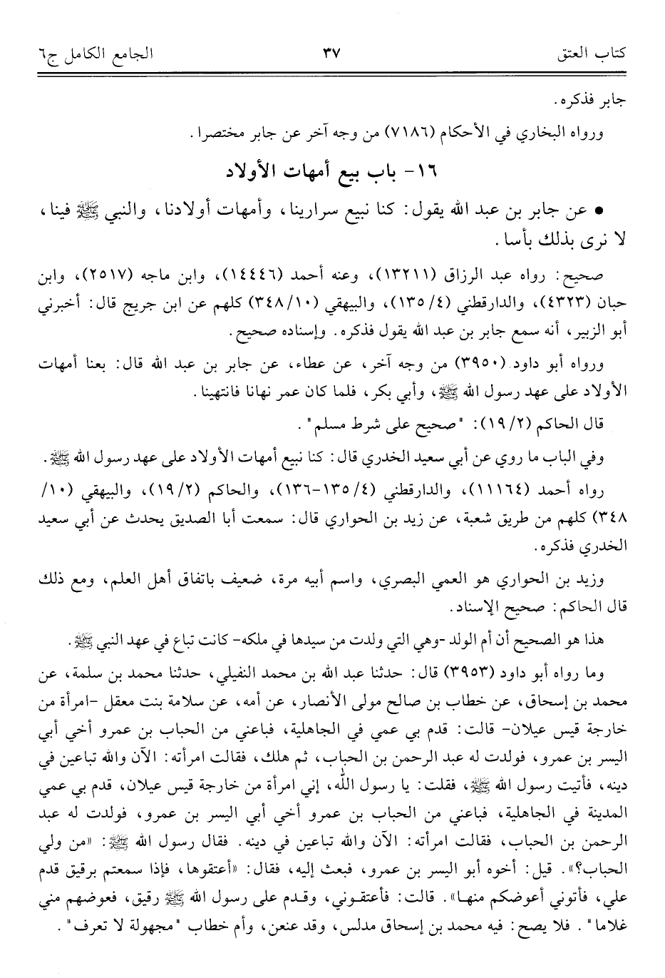 • عن جابر بن عبد اللَّه يقول: كنا نبيع سرارينا، وأمهات أولادنا، والنبي -صلى اللَّه عليه وسلم- فينا، لا نرى بذلك بأسا.