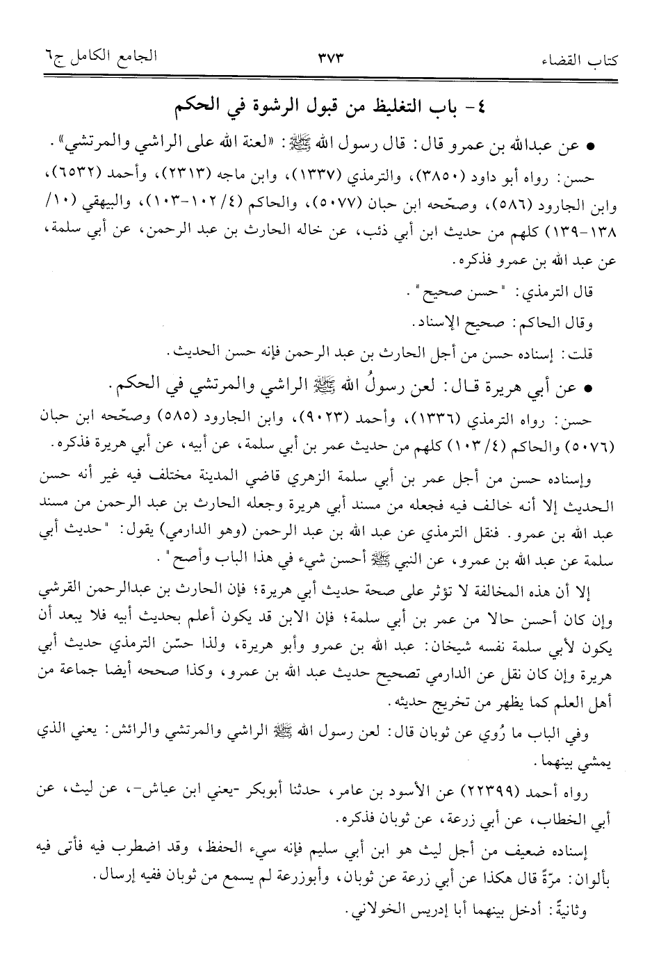 • عن أبي هريرة قال: لعن رسولُ الله - صلى الله عليه وسلم - الراشي والمرتشي في الحكم.