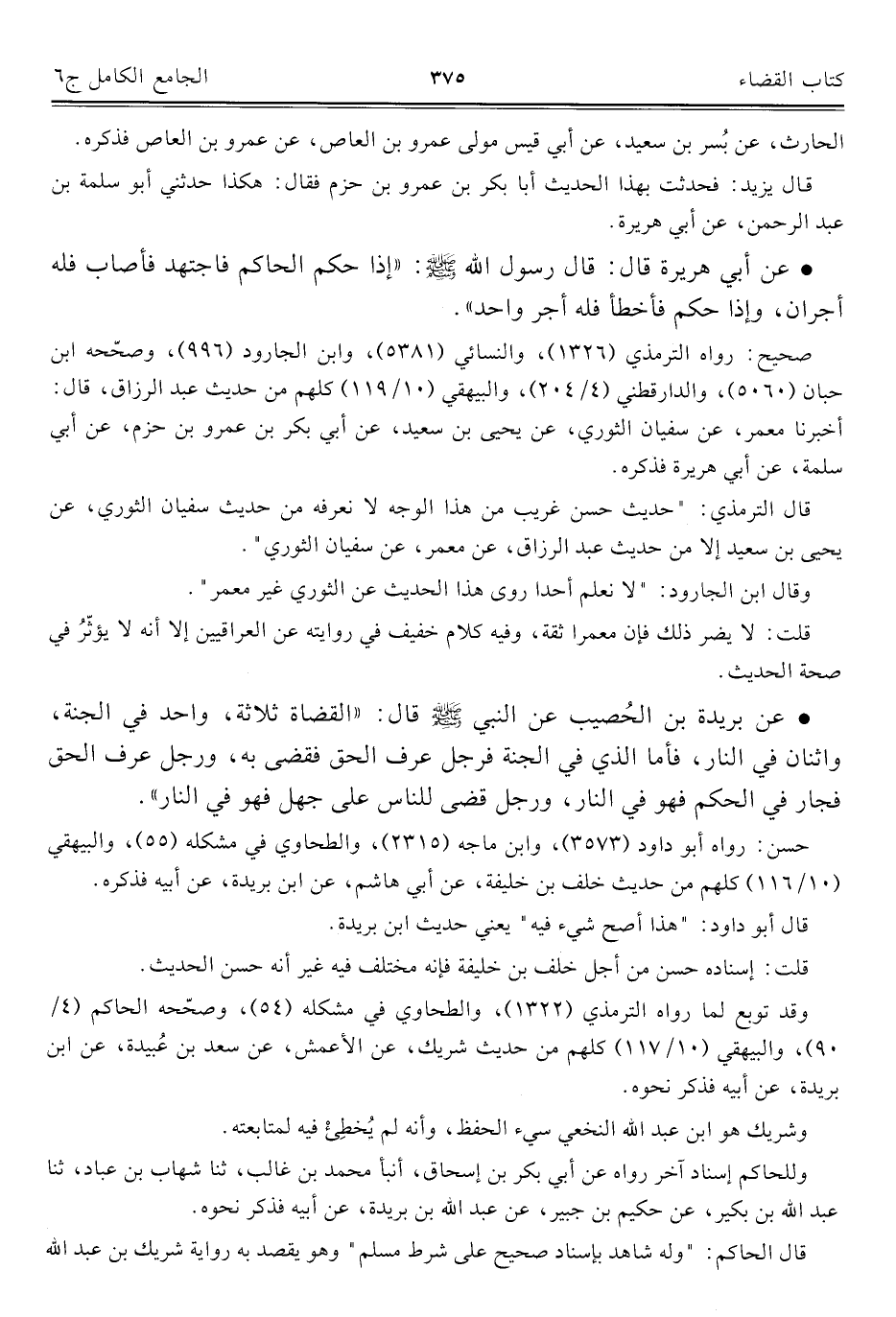 • عن أبي هريرة قال: قال رسول الله - صلى الله عليه وسلم -: "إذا حكم الحاكم فاجتهد فأصاب فله أجران، وإذا حكم فأخطأ فله أجر واحد".