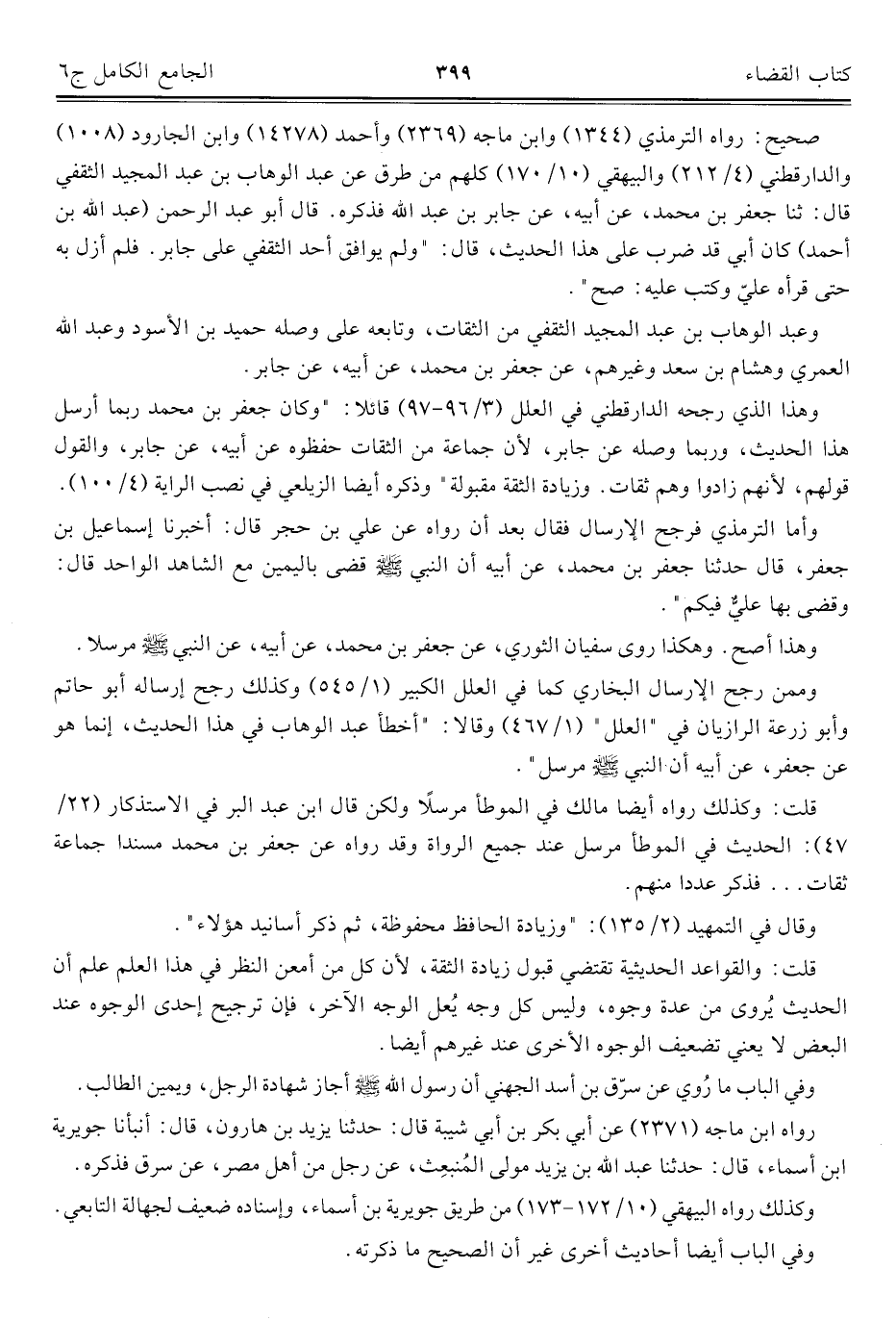 وأمّا الترمذيّ فرجح الإرسال فقال بعد أن رواه عن عليّ بن حجر قال: أخبرنا إسماعيل بن جعفر، قال حَدَّثَنَا جعفر بن محمد، عن أبيه أن النَّبِيّ - صلى الله عليه وسلم - قضى باليمين مع الشاهد الواحد قال: وقضى بها عليٌّ فيكم".