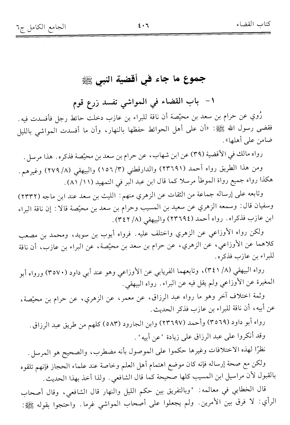 رُوي عن حرام بن سعد بن محيّصة أن ناقة للبراء بن عازب دخلت حائط رجل فأفسدت فيه. فقضى رسول الله - صلى الله عليه وسلم -: "أن على أهل الحوائط حفظها بالنهار، وأن ما أفسدت المواشي بالليل ضامن على أهلها".