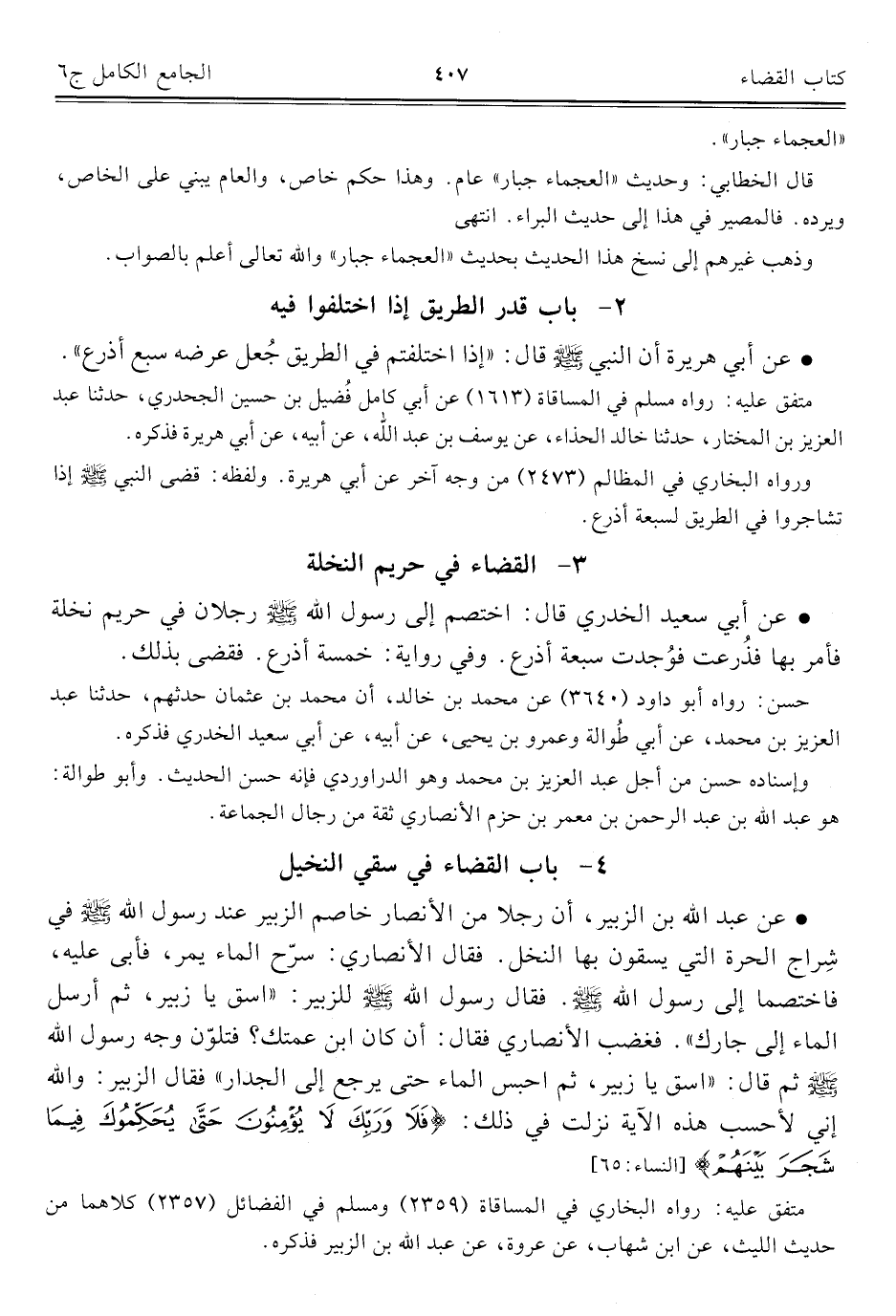 • عن أبي سعيد الخدريّ قال: اختصم إلى رسول الله - صلى الله عليه وسلم - رجلان في حريم نخلة فأمر بها فذُرعت فوُجدت سبعة أذرع. وفي رواية: خمسة أذرع. فقضى بذلك.