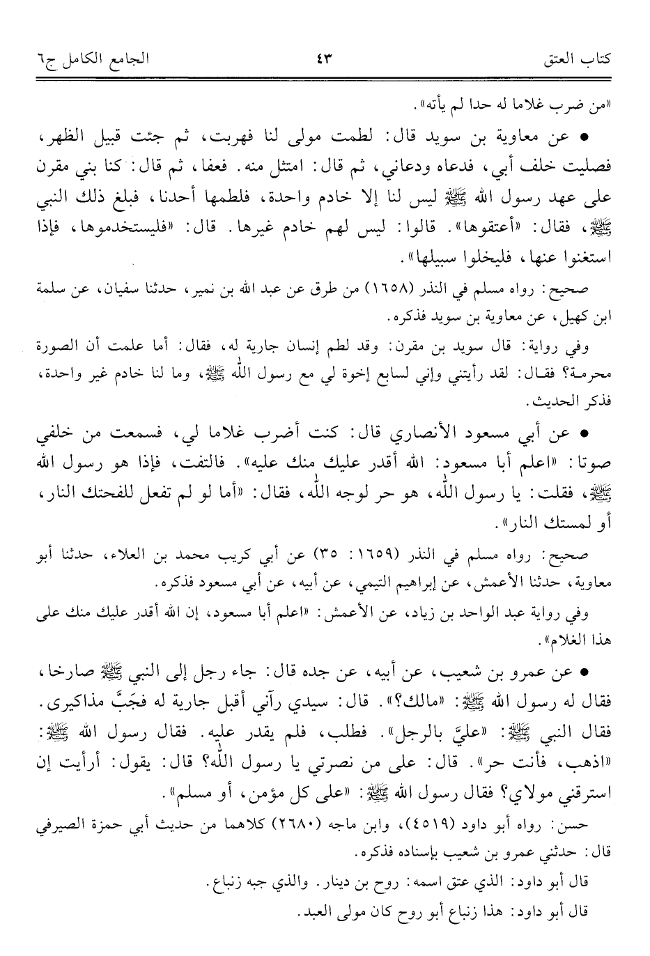 • عن عمرو بن شعيب، عن أبيه، عن جده قال: جاء رجل إلى النبي -صلى اللَّه عليه وسلم- صارخا، فقال له رسول اللَّه -صلى اللَّه عليه وسلم-: "مالك؟ ". قال: سيدي رآني أقبل جارية له فجَبَّ مذاكيري. فقال النبي -صلى اللَّه عليه وسلم-: "عليَّ بالرجل". فطلب، فلم يقدر عليه. فقال رسول اللَّه -صلى اللَّه عليه وسلم-: "اذهب، فأنت حر". قال: على من نصرتي يا رسول اللَّه؟ قال: يقول: أرأيت إن استرقني مولاي؟ فقال رسول اللَّه -صلى اللَّه عليه وسلم-: "على كل مؤمن، أو مسلم".