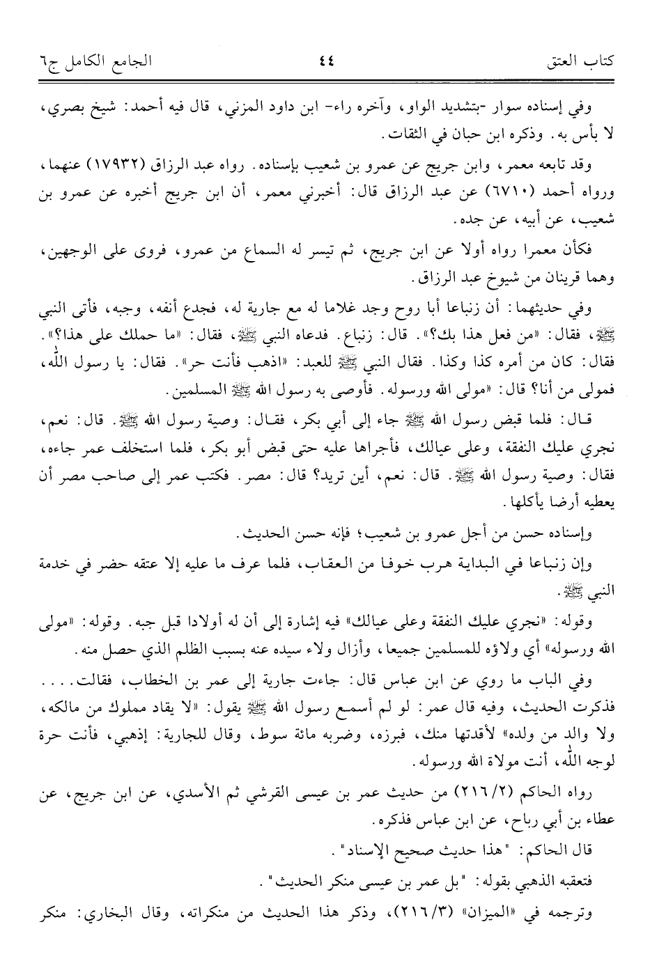 وفي حديثهما: أن زنباعا أبا روح وجد غلاما له مع جارية له، فجدع أنفه، وجبه، فأتى النبي -صلى اللَّه عليه وسلم-، فقال: "من فعل هذا بك؟ ". قال: زنباع. فدعاه النبي -صلى اللَّه عليه وسلم-، فقال: "ما حملك على هذا؟ ". فقال: كان من أمره كذا وكذا. فقال النبي -صلى اللَّه عليه وسلم- للعبد: "اذهب فأنت حر". فقال: يا رسول اللَّه فمولى من أنا؟ قال: "مولى اللَّه ورسوله. فأوصى به رسول اللَّه -صلى اللَّه عليه وسلم- المسلمين.