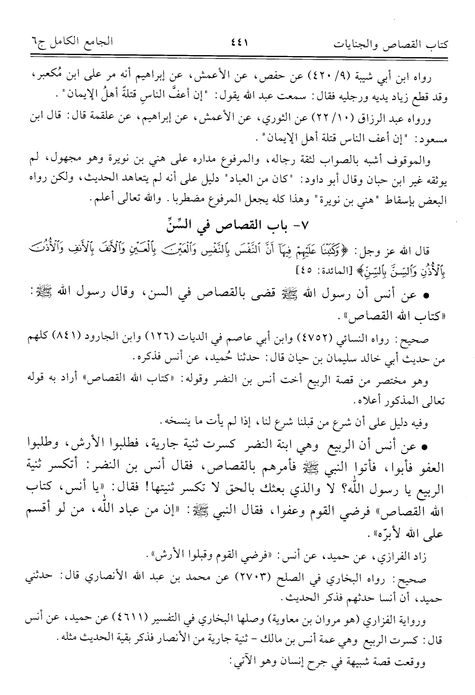 • عن أنس أن رسول الله صلَّى الله عليه وسلَّم قضى بالقصاص في السن، وقال رسول الله - صلى الله عليه وسلم -: "كتاب الله القصاص".