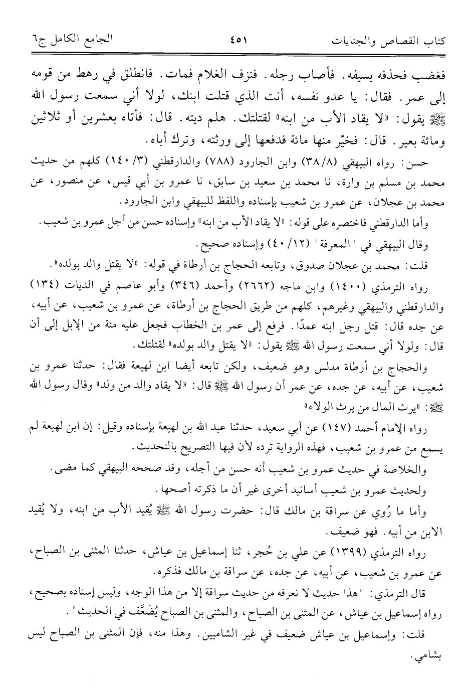 وأما ما رُوي عن سراقة بن مالك قال: حضرت رسول الله - صلى الله عليه وسلم - يُقيد الأب من ابنه، ولا يُقيد الابن من أبيه. فهو ضعيف.