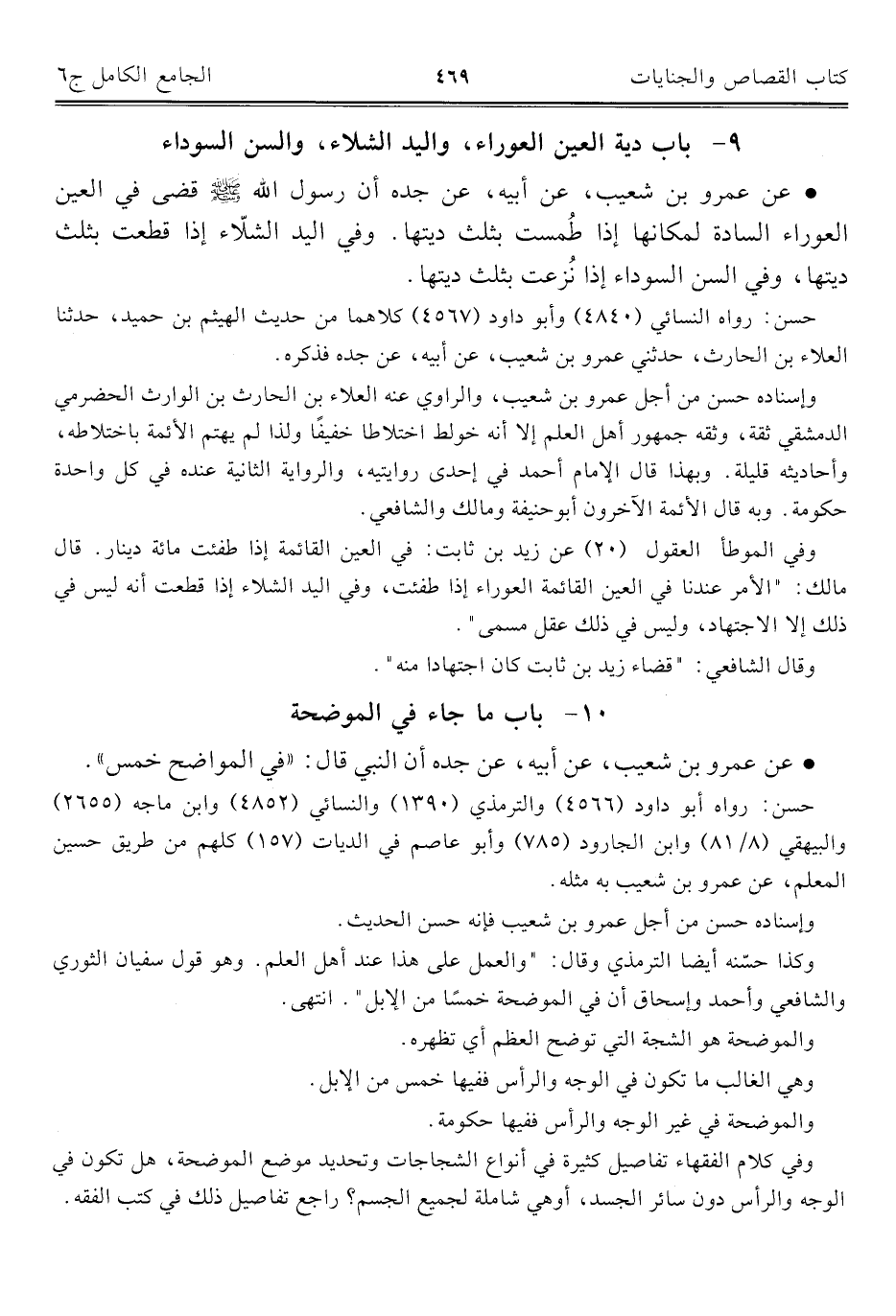 وإسناده حسن من أجل عمرو بن شعيب، والراوي عنه العلاء بن الحارث بن الوارث الحضرمي الدّمشقيّ ثقة، وثَّقه جمهور أهل العلم إِلَّا أنه خولط اختلاطا خفيفًا ولذا لم يهتم الأئمة باختلاطه، وأحاديثه قليلة. وبهذا قال الإمام أحمد في إحدى روايتيه، والرّواية الثانية عنده في كل واحدة حكومة. وبه قال الأئمة الآخرون أبو حنيفة ومالك والشافعي.