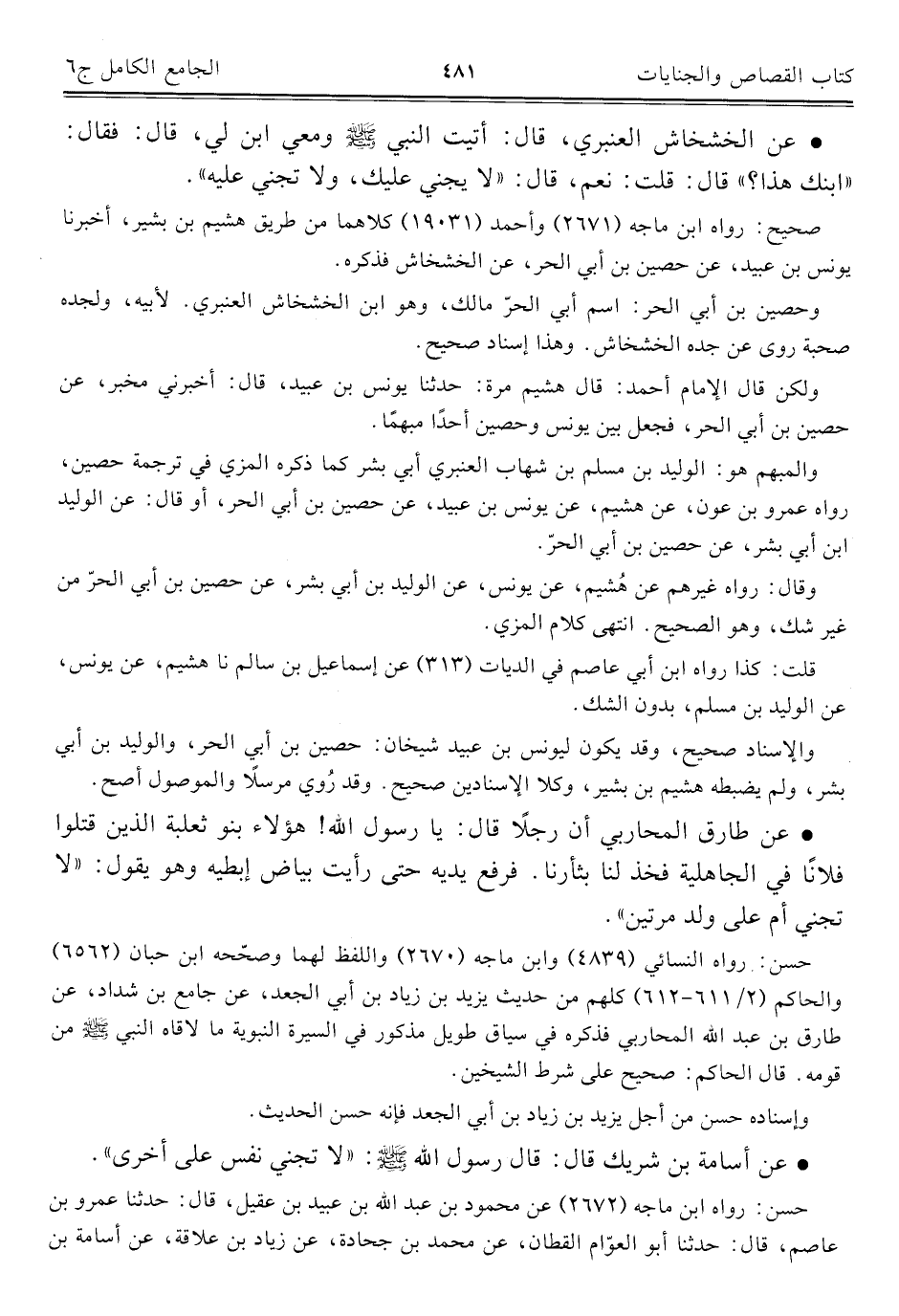 • عن أسامة بن شريك قال: قال رسول الله - صلى الله عليه وسلم -: "لا تجني نفس على أخرى".