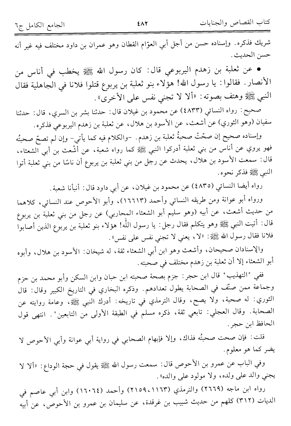 ورواه أبو عوانة ومن طريقه النسائيّ وأحمد (١٦٦١٣)، وأبو الأحوص عند النسائيّ، كلاهما من حديث أشعث، عن أبيه (وهو سليم أبو الشعثاء المحاربي) عن رجل من بني ثعلبة بن يربوع قال: أتيت النَّبِيّ صلى الله عليه وسلم وهو يتكلم فقال رجل: يا رسول الله! هؤلاء بنو ثعلبة بن يربوع الذين أصابوا فلانًا فقال رسول الله - صلى الله عليه وسلم -: "لا، يعني لا تجني نفس على نفس".