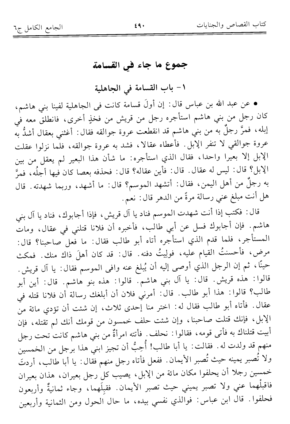 • عن عبد الله بن عباس قال: إن أولَ قسامة كانت في الجاهليّة لفينا بني هاشم، كان رجل من بني هاشم استأجره رجل من قريش من فخذٍ أخرى، فانطلق معه في إبله، فمرَّ رجلٌ به من بني هاشم قد انقطعت عروة جوالقه فقال: أغثني بعقال أشدُّ به عروة جوالقي لا تنفر الإبل. فأعطاه عقالا، فشد به عروة جوالقه، فلمّا نزلوا عقلت الإبل إِلَّا بعيرا واحدًا، فقال الذي استأجره: ما شأن هذا البعير لم يعقل من بين الإبل؟ قال: ليس له عقال. قال: فأين عقاله؟ قال: فحذفه بعصا كان فيها أجلُه، فمرَّ به رجلٌ من أهل اليمن، فقال: أتشهد الموسم؟ قال: ما أشهد، وربما شهدته. قال هل أنت مبلغ عني رسالة مرةً من الدَّهر قال: نعم.