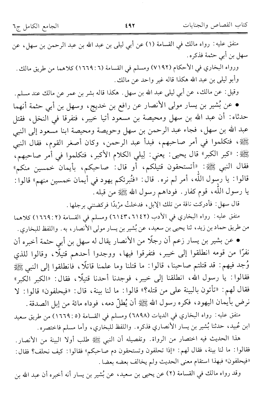 • عن بشير بن يسار مولى الأنصار عن رافع بن خديج، وسهل بن أبي حثمة أنهما حدثاه: أن عبد الله بن سهل ومحيصة بن مسعود أتيا خيبر، فتفرقا في النخل، فقتل عبد الله بن سهل، فجاء عبد الرحمن بن سهل وحويصة ومحيصة ابنا مسعود إلى النَّبِيّ - صلى الله عليه وسلم -، فتكلموا في أمر صاحبهم، فبدأ عبد الرحمن، وكان أصغر القوم، فقال النَّبِيّ - صلى الله عليه وسلم -: "كبر الكبر" قال يحيى: يعني: لِيلي الكلام الأكبر، فتكلموا في أمر صاحبهم، فقال النَّبِيّ - صلى الله عليه وسلم -: "أتستحقون قتيلكم، أو قال: صاحبكم، بأيمان خمسين منكم" قالوا: يا رسول الله، أمر لم نره. قال: "فتُبرئكم يهود في أيمان خمسين منهم" قالوا: يا رسول الله، قوم كفار. فوداهم رسول الله - صلى الله عليه وسلم - من قبله.
