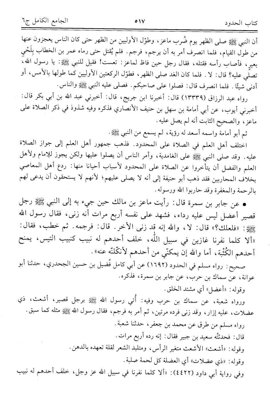 • عن جابر بن سمرة قال: رأيت ماعز بن مالك حين جيء به إلى النبي - صلى الله عليه وسلم - رجل قصير أعضل ليس عليه رداء، فشهد على نفسه أربع مرات أنه زنى، فقال رسول الله - صلى الله عليه وسلم -: "فلعلك؟ " قال: لا، والله إنه قد زنى الأخر. قال: فرجمه. ثم خطب، فقال: ألا كلما نفرنا غازين في سبيل الله، خلف أحدهم له نبيب كنبيب التيس، يمنح أحدهم الكُثْبة، أما والله إن يمكنّي من أحدهم لأنكّلنّه عنه".