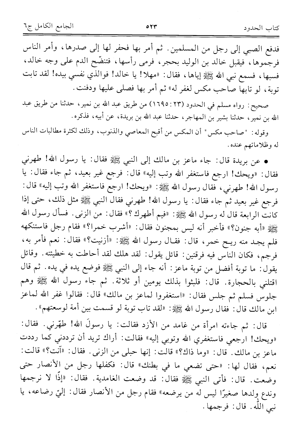 • عن بريدة قال: جاء ماعز بن مالك إلى النبي - صلى الله عليه وسلم - فقال: يا رسول الله! طهرني فقال: "ويحك! ارجع فاستغفر الله وتب إليه" قال: فرجع غير بعيد، ثم جاء فقال: يا رسول الله! طهرني، فقال رسول الله - صلى الله عليه وسلم -: "ويحك! ارجع فاستغفر الله وتب إليه" قال: فرجع غير بعيد ثم جاء فقال: يا رسول الله! طهرني فقال النبي - صلى الله عليه وسلم - مثل ذلك، حتى إذا كانت الرابعة قال له رسول الله - صلى الله عليه وسلم -: "فيم أطهرك؟ " فقال: من الزنى. فسأل رسول الله - صلى الله عليه وسلم - "أبه جنون؟ " فأخبر أنه ليس بمجنون فقال: "أشرب خمرا؟ " فقام رجل فاستنكهه فلم يجد منه ريح خمر، قال: فقال رسول الله - صلى الله عليه وسلم -: "أزنيت؟ " فقال: نعم فأمر به، فرجم، فكان الناس فيه فرقتين: قائل يقول: لقد هلك لقد أحاطت به خطيئته. وقائل يقول: ما توبة أفضل من توبة ماعز: أنه جاء إلى النبي - صلى الله عليه وسلم - فوضع يده في يده. ثم قال اقتلني بالحجارة. قال: فلبثوا بذلك يومين أو ثلاثة. ثم جاء رسول الله - صلى الله عليه وسلم - "وهم جلوس فسلم ثم جلس فقال: "استغفروا لماعز بن مالك" قال: فقالوا غفر الله لماعز بن مالك قال: فقال رسول الله: "لقد تاب توبة لو قسمت بين أمة لوسعتهم".