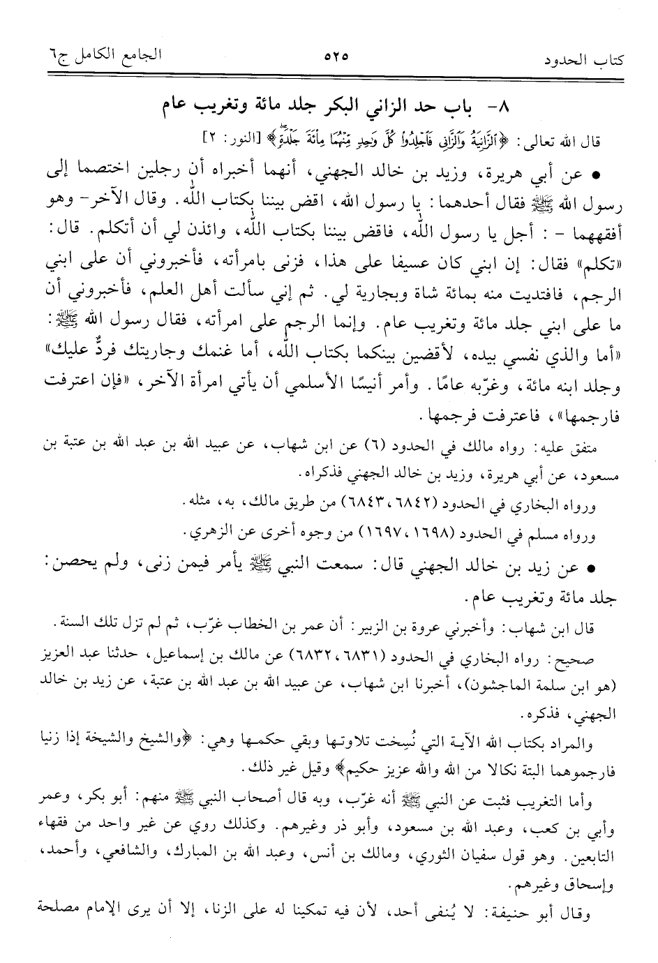 • عن زيد بن خالد الجهني قال: سمعت النبي - صلى الله عليه وسلم - يأمر فيمن زنى، ولم يحصن جلد مائة وتغريب عام.