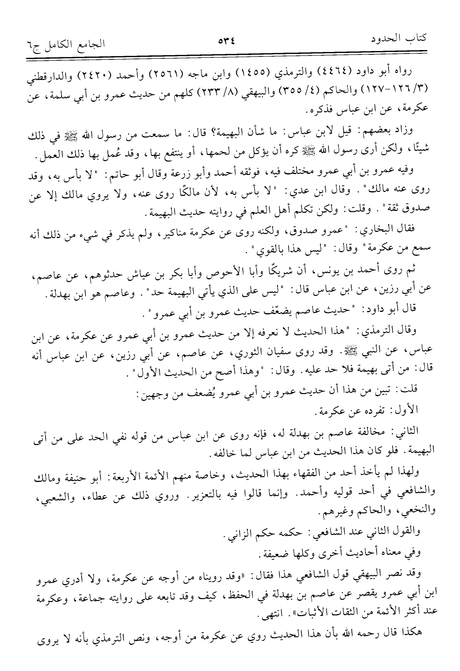 وقال الترمذي: "هذا الحديث لا نعرفه إلا من حديث عمرو بن أبي عمرو عن عكرمة، عن ابن عباس، عن النبي - صلى الله عليه وسلم -. وقد روي سفيان الثوري، عن عاصم، عن أبي رزين، عن ابن عباس أنه قال: من أتي بهيمة فلا حد عليه. وقال: "وهذا أصح من الحديث الأول".