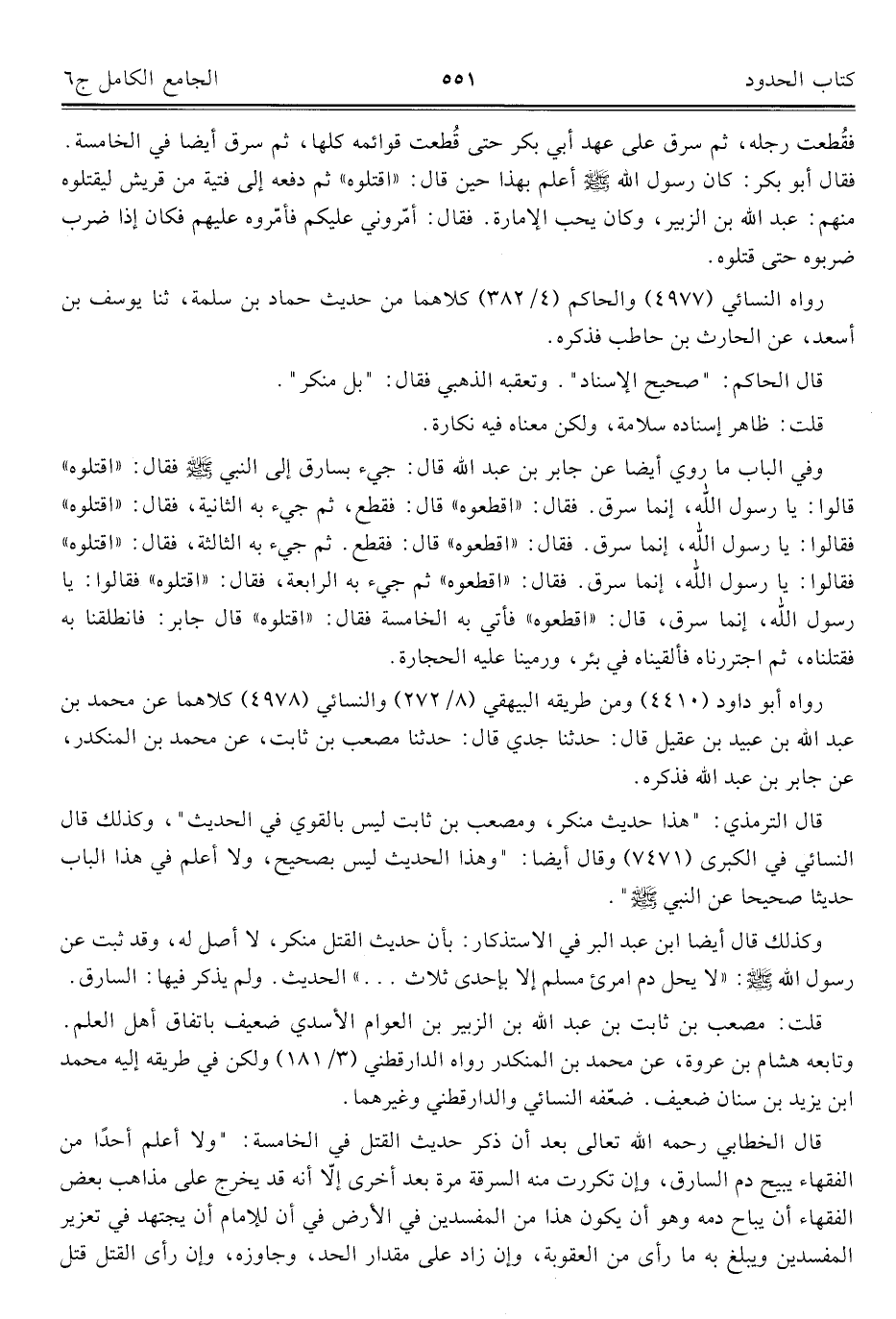 وكذلك قال أيضا ابن عبد البر في الاستذكار: بأن حديث القتل منكر، لا أصل له، وقد ثبت عن رسول الله - صلى الله عليه وسلم -: "لا يحل دم امرئ مسلم إلا بإحدى ثلاث ... الحديث. ولم يذكر فيها: السارق.