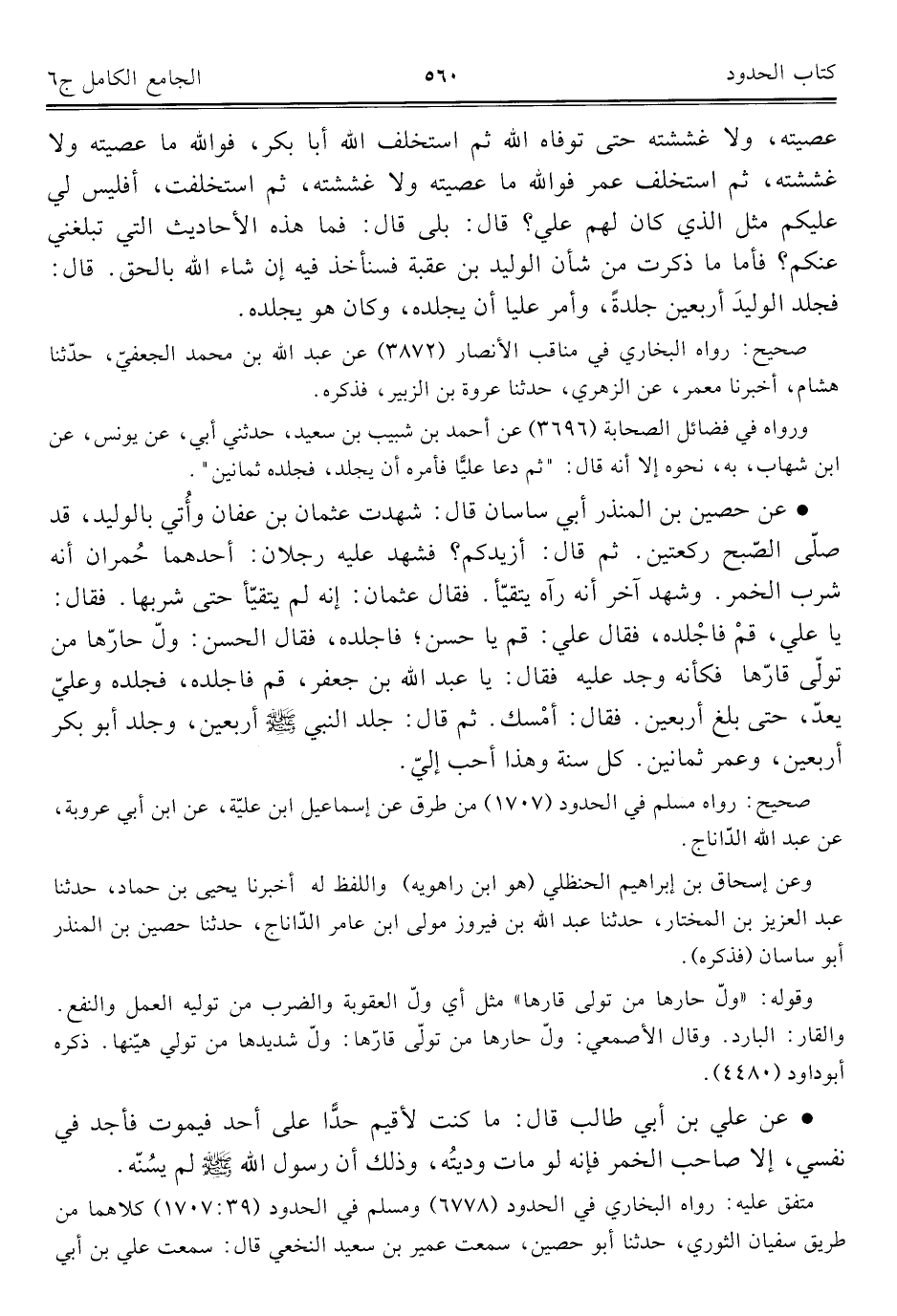 • عن حصين بن المنذر أبي ساسان قال: شهدت عثمان بن عفان وأُتي بالوليد، قد صلّى الصّبح ركعتين. ثم قال: أزيدكم؟ فشهد عليه رجلان: أحدهما حُمران أنه شرب الخمر. وشهد آخر أنه رآه يتقيّأ. فقال عثمان: إنه لم يتقيّأ حتى شربها. فقال: يا علي، قمْ فاجْلده، فقال علي: قم يا حسن؛ فاجلده، فقال الحسن: ولّ حارّها من تولّي قارّها فكأنه وجد عليه فقال: يا عبد الله بن جعفر، قم فاجلده، فجلده وعليّ يعدّ، حتى بلغ أربعين. فقال: أمسك. ثم قال: جلد النبي - صلى الله عليه وسلم - أربعين، وجلد أبو بكر أربعين، وعمر ثمانين. كل سنة وهذا أحب إليّ.