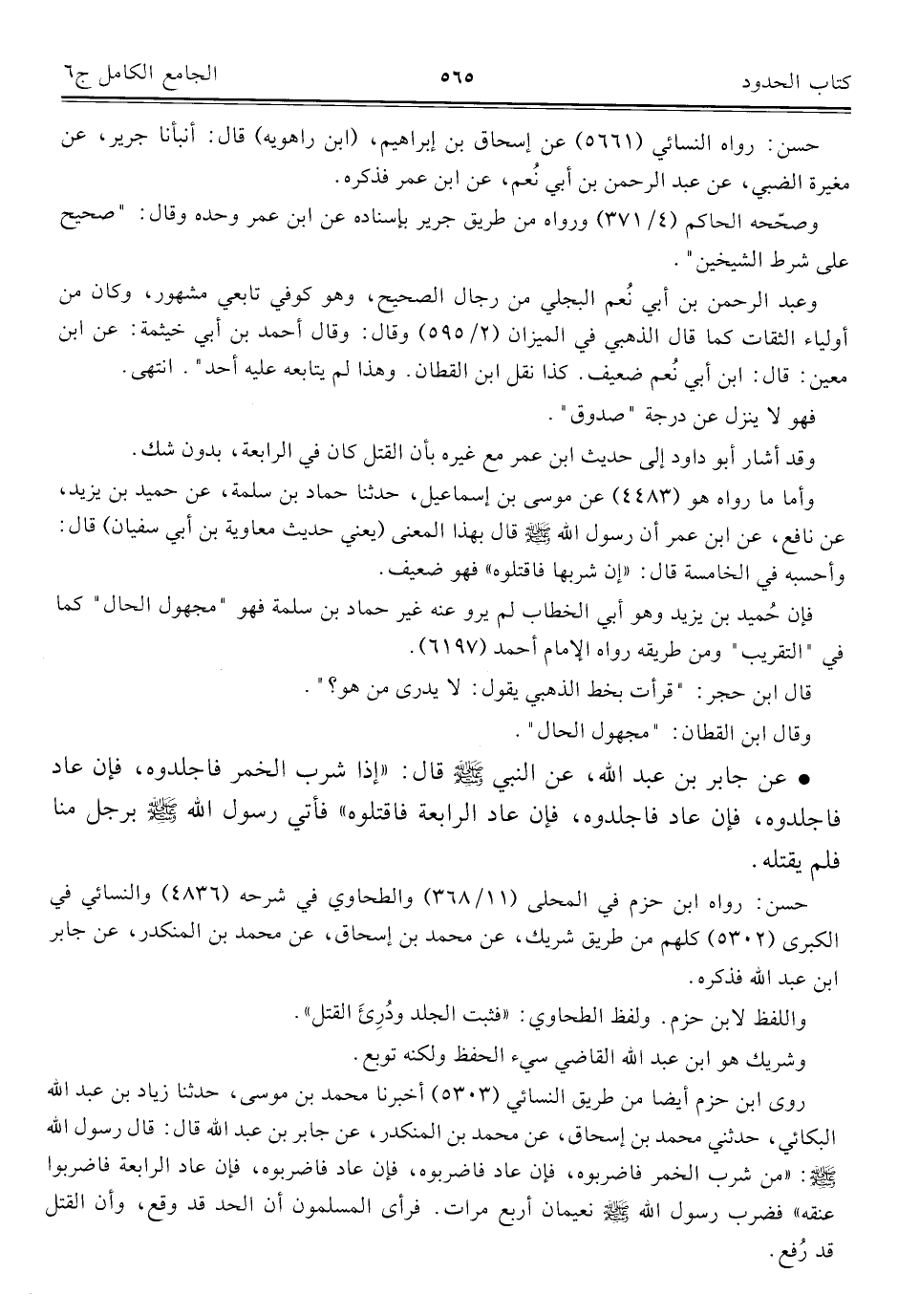 روي ابن حزم أيضا من طريق النسائي (٥٣٠٣) أخبرنا محمد بن موسى، حدثنا زياد بن عبد الله البكائي، حدثني محمد بن إسحاق، عن محمد بن المنكدر، عن جابر بن عبد الله قال: قال رسول الله - صلى الله عليه وسلم -: "من شرب الخمر فاضربوه، فإن عاد فاضربوه، فإن عاد فاضربوه، فإن عاد الرابعة فاضربوا عنقه" فضرب رسول الله - صلى الله عليه وسلم - نعيمان أربع مرات. فرأى المسلمون أن الحد قد وقع، وأن القتل قد رُفع.