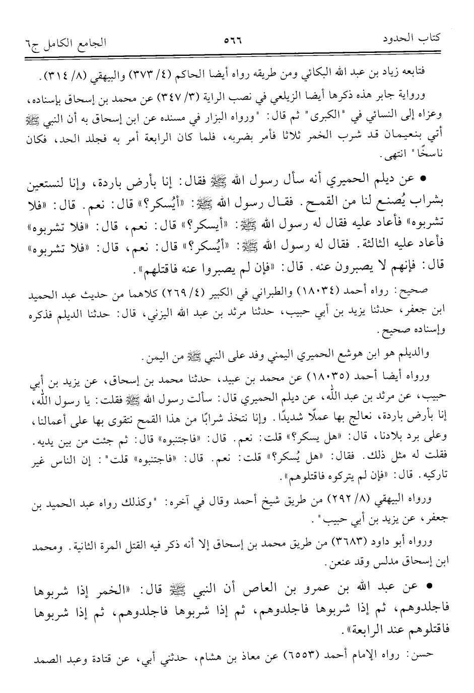 • عن عبد الله بن عمرو بن العاص أن النبي صلى الله عليه وسلم قال: "الخمر إذا شربوها فاجلدوهم، ثم إذا شربوها فاجلدوهم، ثم إذا شربوها فاجلدوهم، ثم إذا شربوها فاقتلوهم عند الرابعة".