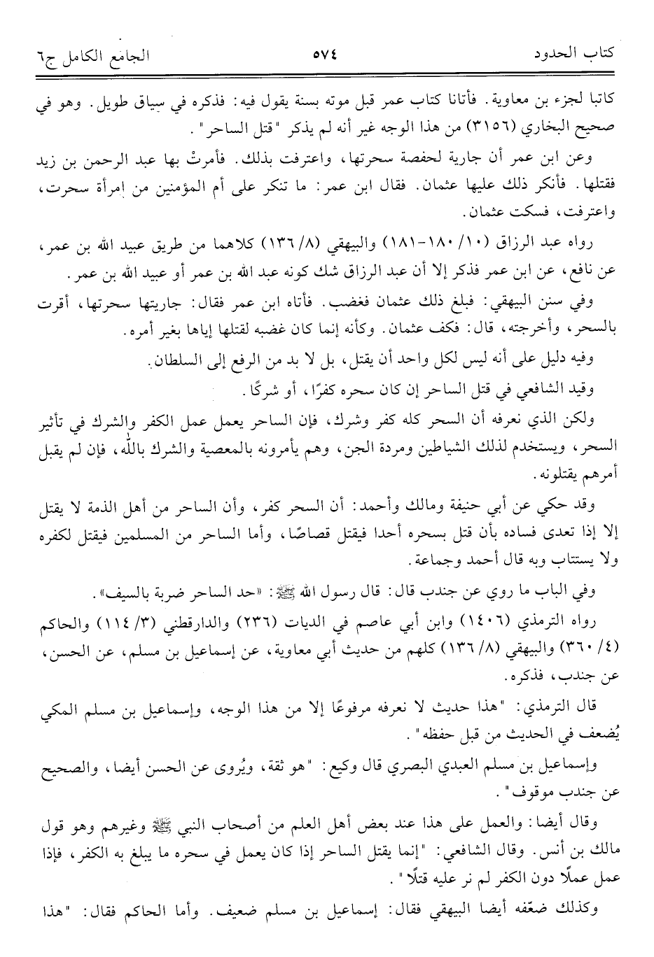 وقال أيضا: والعمل على هذا عند بعض أهل العلم من أصحاب النبي صلى الله عليه وسلم وغيرهم وهو قول مالك بن أنس. وقال الشافعي: "إنما يقتل الساحر إذا كان يعمل في سحره ما يبلغ به الكفر، فإذا عمل عملا دون الكفر لم نر عليه قتلًا".