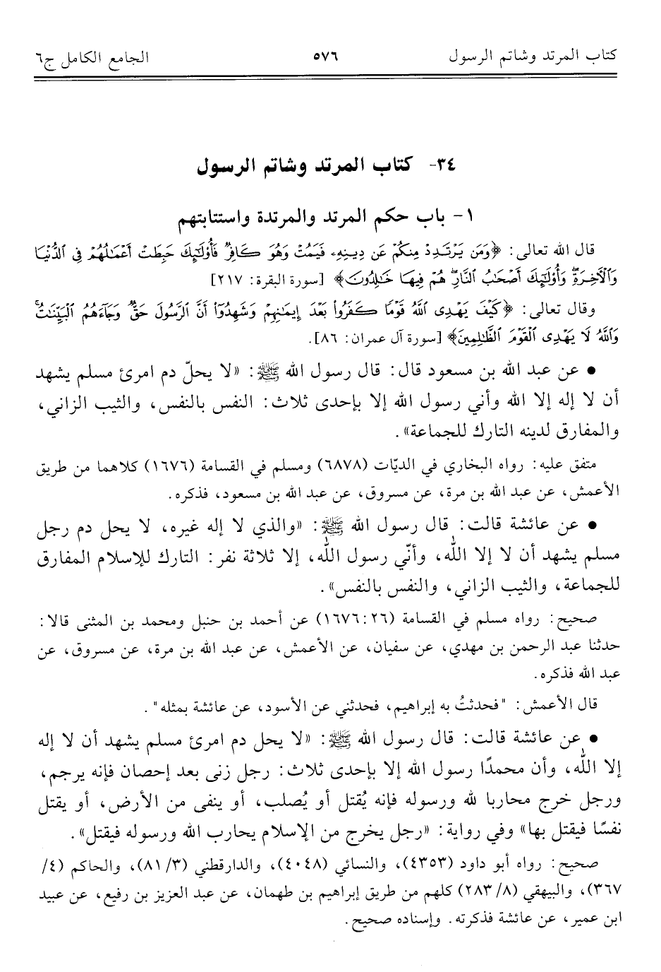 • عن عائشة قالت: قال رسول الله - صلى الله عليه وسلم -: "لا يحل دم امرئ مسلم يشهد أن لا إله إلا الله، وأن محمدًا رسول الله إلا بإحدى ثلاث: رجل زنى بعد إحصان فإنه يرجم، ورجل خرج محاربا لله ورسوله فإنه يُقتل أو يُصلب، أو ينفى من الأرض، أو يقتل نفسًا فيقتل بها، وفي رواية: "رجل يخرج من الإسلام يحارب الله ورسوله فيقتل".