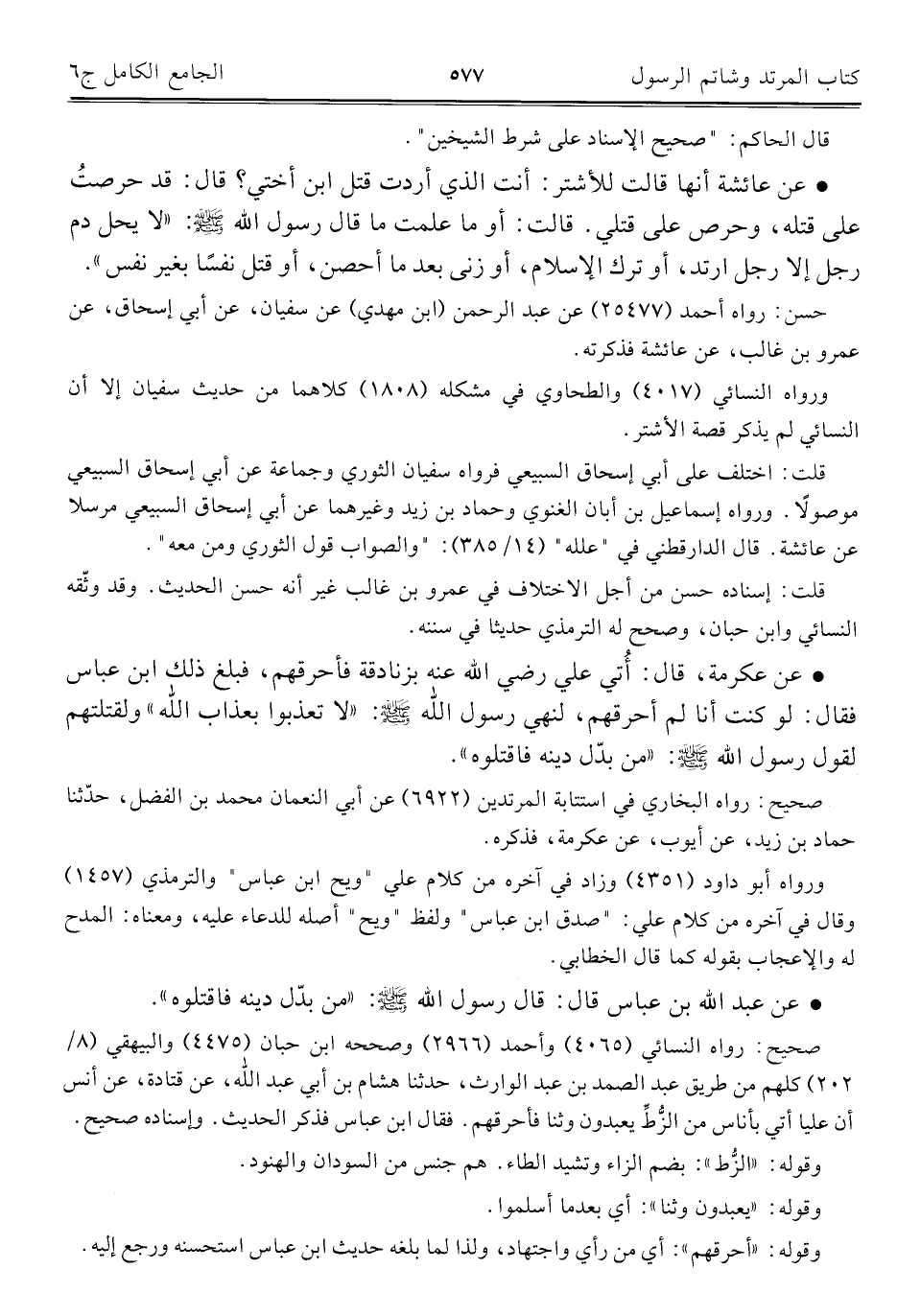 • عن عكرمة، قال: أُتي علي رضي الله عنه بزنادقة فأحرقهم، فبلغ ذلك ابن عباس فقال: لو كنت أنا لم أحرقهم، لنهي رسول الله - صلى الله عليه وسلم -: "لا تعذبوا بعذاب الله" ولقتلتهم القول رسول الله - صلى الله عليه وسلم -: "من بدل دينه فاقتلوه".