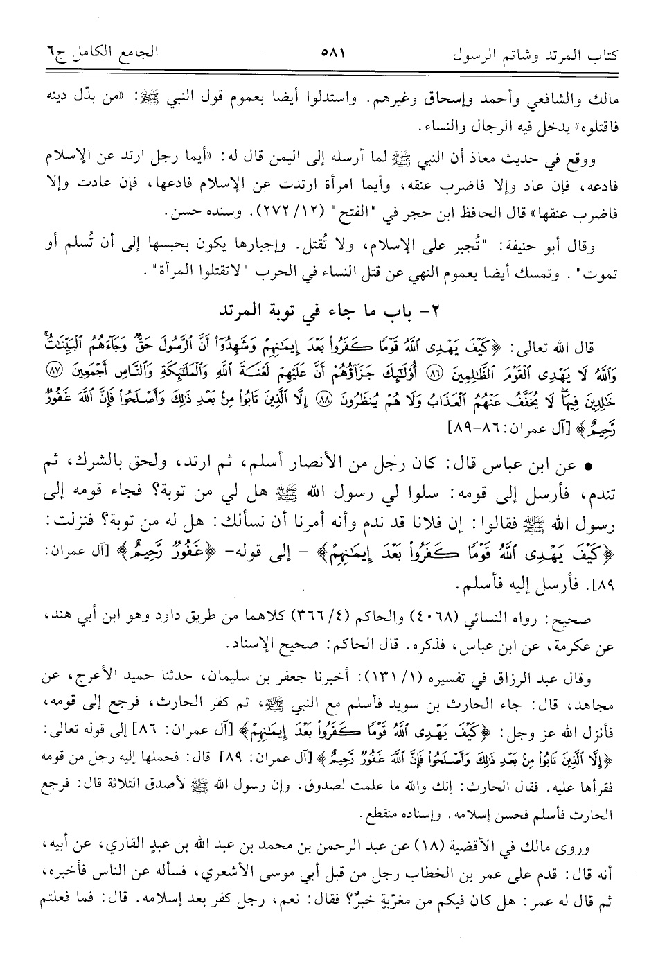 ووقع في حديث معاذ أن النبي - صلى الله عليه وسلم - لما أرسله إلى اليمن قال له: "أيما رجل ارتد عن الإسلام فادعه، فإن عاد وإلا فاضرب عنقه، وأيما امرأة ارتدت عن الإسلام فادعها، فإن عادت وإلا فاضرب عنقها" قال الحافظ ابن حجر في "الفتح" (١٢/ ٢٧٢)، وسنده حسن.
