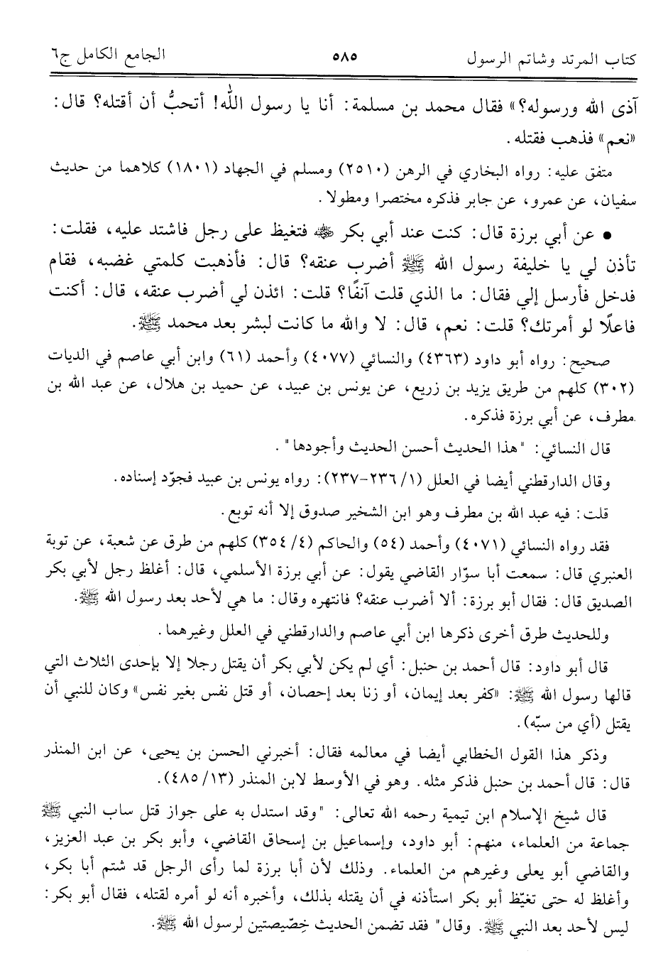قال أبو داود: قال أحمد بن حنبل: أي لم يكن لأبي بكر أن يقتل رجلا إلا بإحدى الثلاث التي قالها رسول الله - صلى الله عليه وسلم -: "كفر بعد إيمان، أو زنا بعد إحصان، أو قتل نفس بغير نفسه وكان للنبي أن يقتل (أي من سبّه).