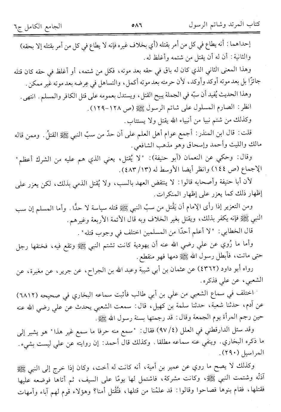 ومن التعزير إذا رأى الإمام أن يَقْتل من سبّ النبي - صلى الله عليه وسلم - قتله سياسة لا حدًّا. وأما المسلم إن سب النبي صلى الله عليه وسلم فإنه يكفر بذلك، ويقتل بغير الخلاف وبه قال الأئمة الأربعة وغيرهم.