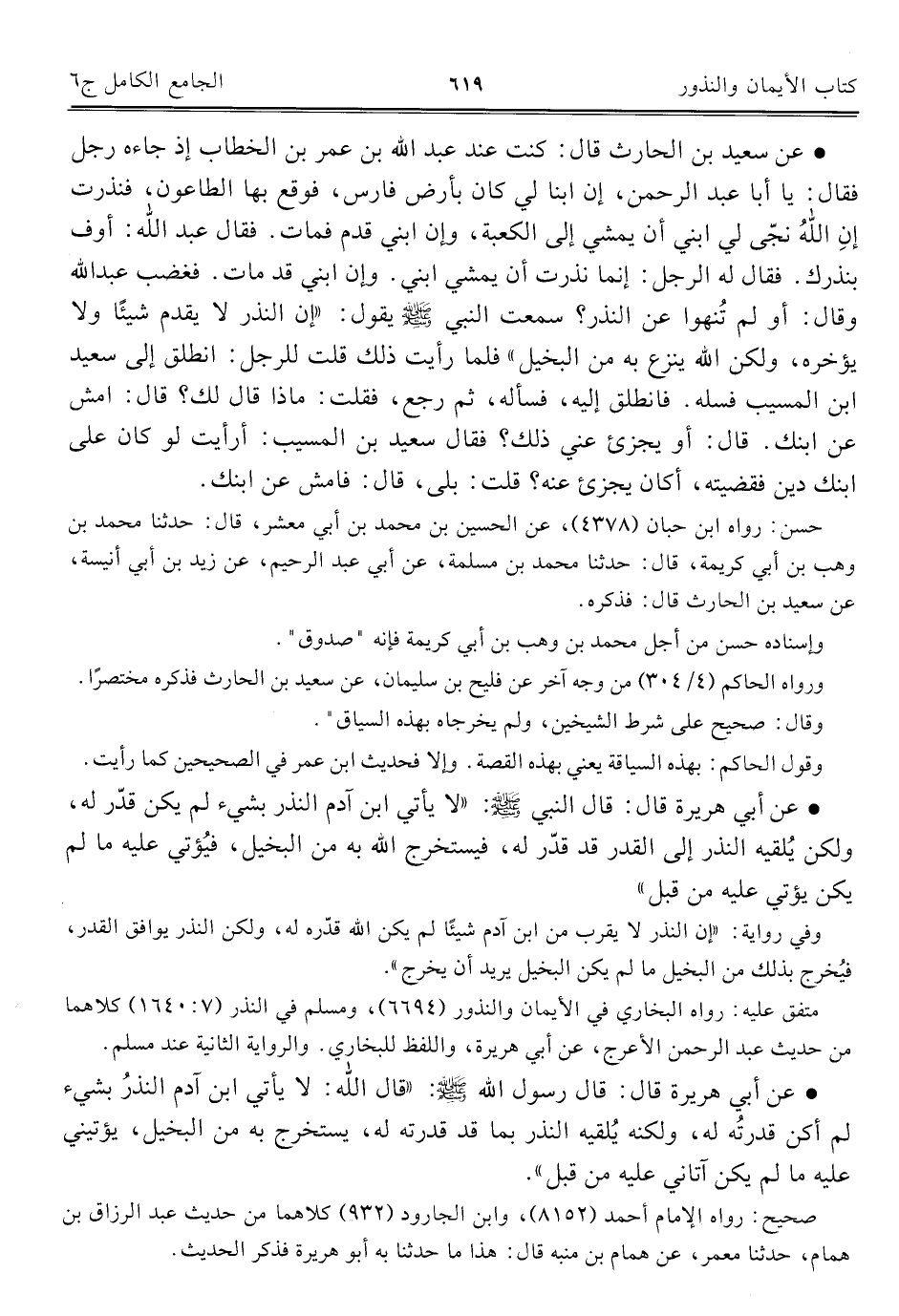 • عن أبي هريرة قال: قال النَّبِيّ - صلى الله عليه وسلم -: "لا يأتي ابن آدم النذر بشيء لم يكن قدّر له، ولكن يُلقيه النذر إلى القدر قد قدّر له، فيستخرج الله به من البخيل، فيُؤتي عليه ما لم يكن يؤتي عليه من قبل" وفي رواية: